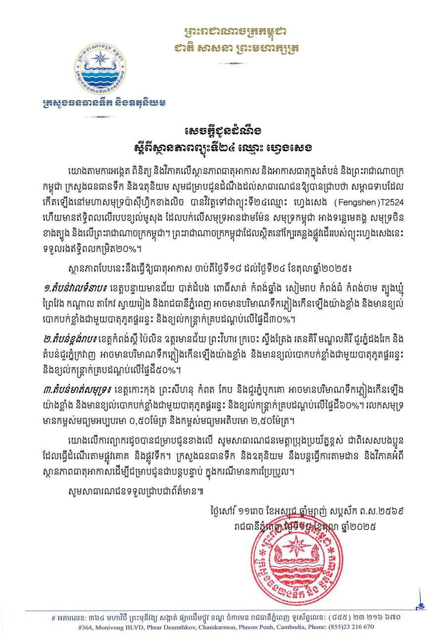 ភ្នំពេញ៖ ប្រភពព័ត៌មានពីក្រសួងធនធានទឹក និងឧតុនិយម បានឱ្យដឹងនារសៀលថ្ងៃទី១៨ ខែតុលាឆ្នាំ២០២៥នេះថា យោងតាមការអង្កេត ពិនិត្យ និងវិភាគលើស្ថានភាពធាតុអាកាស និងអាកាសធាតុក្នុងតំបន់ និងព្រះរាជាណាចក្រ កម្ពុជា ក្រសួងធនធានទឹក និងឧតុនិយម សូមជម្រាបជូនដំណឹងដល់សាធារណជនឱ្យបានជ្រាបថា សម្ពាធទាបដែល កើតឡើងនៅមហាសមុទ្រប៉ាស៊ីហ្វិកខាងលិច បានវិវត្តទៅជាព្យុះទី២៤ឈ្មោះ ហ្វេងសេង (Fengshen)T2524 ហើយមានឥទ្ធិពលលើរបបខ្យល់មូសុង ដែលបក់លើសមុទ្រអានដាមម៉ែន សមុទ្រកម្ពុជា អាងទន្លេមេគង្គ សមុទ្រចិន ខាងត្បូង និងលើព្រះរាជាណាចក្រកម្ពុជា។ ព្រះរាជាណាចក្រកម្ពុជាដែលស្ថិតនៅក្បែរគន្លងផ្លូវដើររបស់ព្យុះហ្វេងសេងនេះ ទទួលរងឥទ្ធិពលកម្រិត២០%។