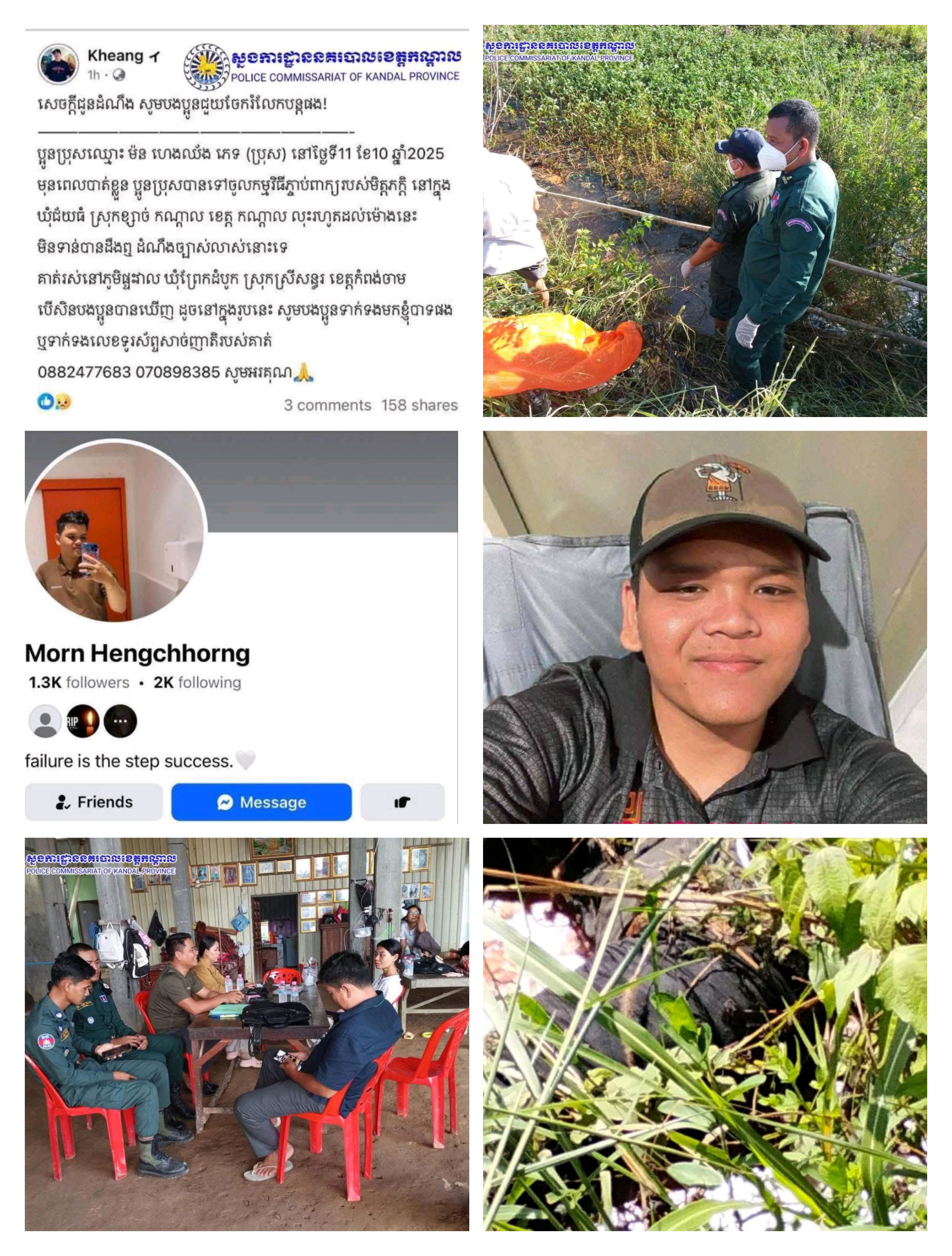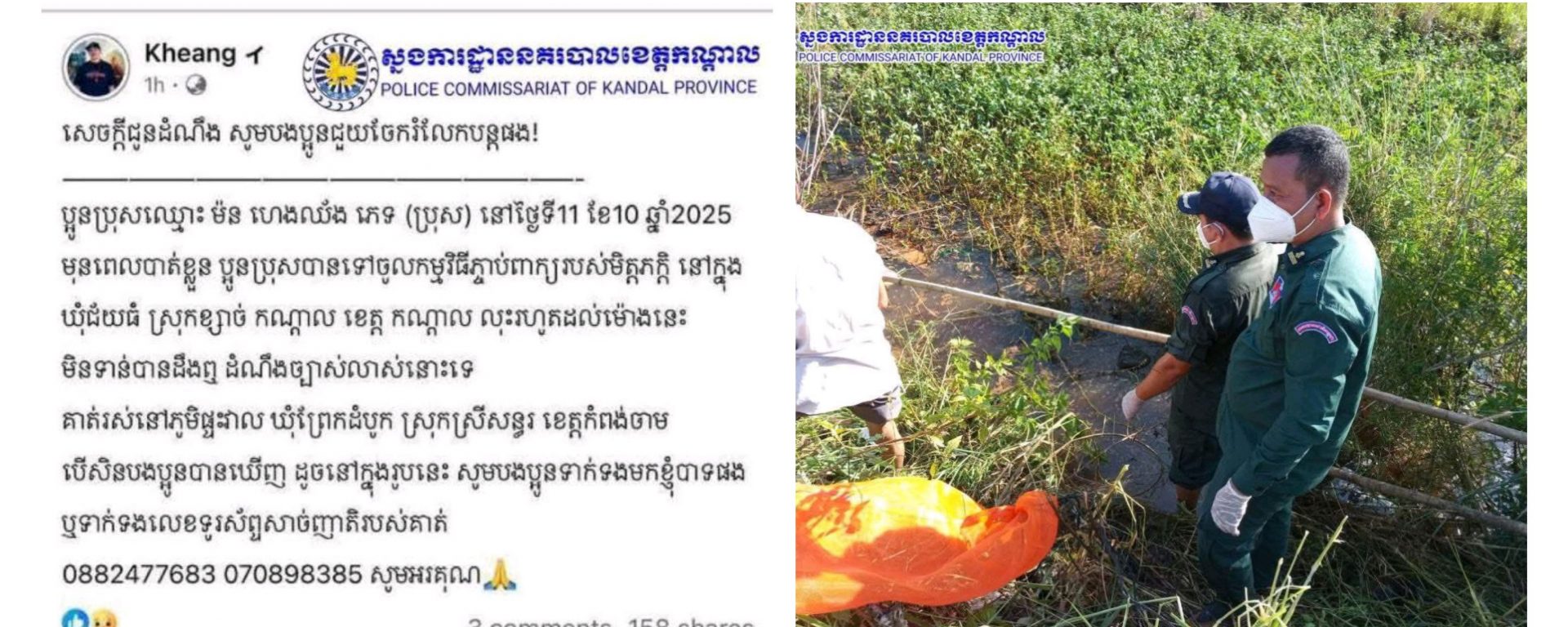 រហូតមកដល់ថ្ងៃទី១៨ ខែតុលា ឆ្នាំ២០២៥ វេលាម៉ោង ១៣:៣០នាទី ប្រជាពលរដ្ឋបានប្រទះឃើញសាកសព ជនរងគ្រោះនៅក្នុងប្រឡាយអែបផ្លូវជាតិលេខ៨ ចំណុច មុខវត្តព្រៃបាំង ស្ថិតភូមិព្រៃបាំង ឃុំស៊ីធរ ស្រុកខ្សាច់កណ្ដាល ខេត្តកណ្ដាល ។