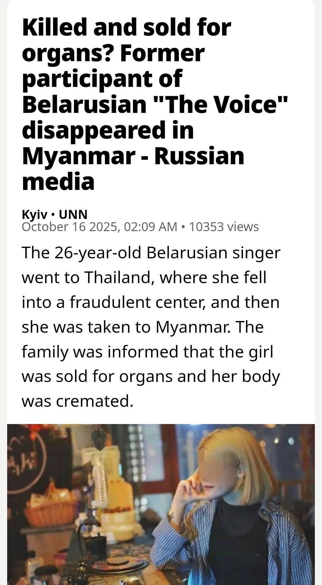 ទីក្រុងហុងកុង៖ បើតាមការចុះផ្សាយពីសារព័ត៌មានហុងកុង The Standard ក្នុងសប្តាហ៍នេះថា៖ នារីអាយុ២៦ឆ្នាំម្នាក់ ដែលជាតារាចម្រៀងនិងតារាម៉ូដែលជនជាតិបេឡារុស ត្រូវបានគេសម្លាប់ រួចថែមទាំងវះយកសរីរាង្គ បន្ទាប់ពីនាងបានចាញ់បោកគេទៅកាន់ប្រទេសថៃ ហើយត្រូវបានជួញដូរឱ្យទៅបម្រើការ នៅកន្លែងប្រព្រឹត្តអំពើឆបោកតាមអនឡាញ នៅឯប្រទេសមីយ៉ាន់ម៉ា។