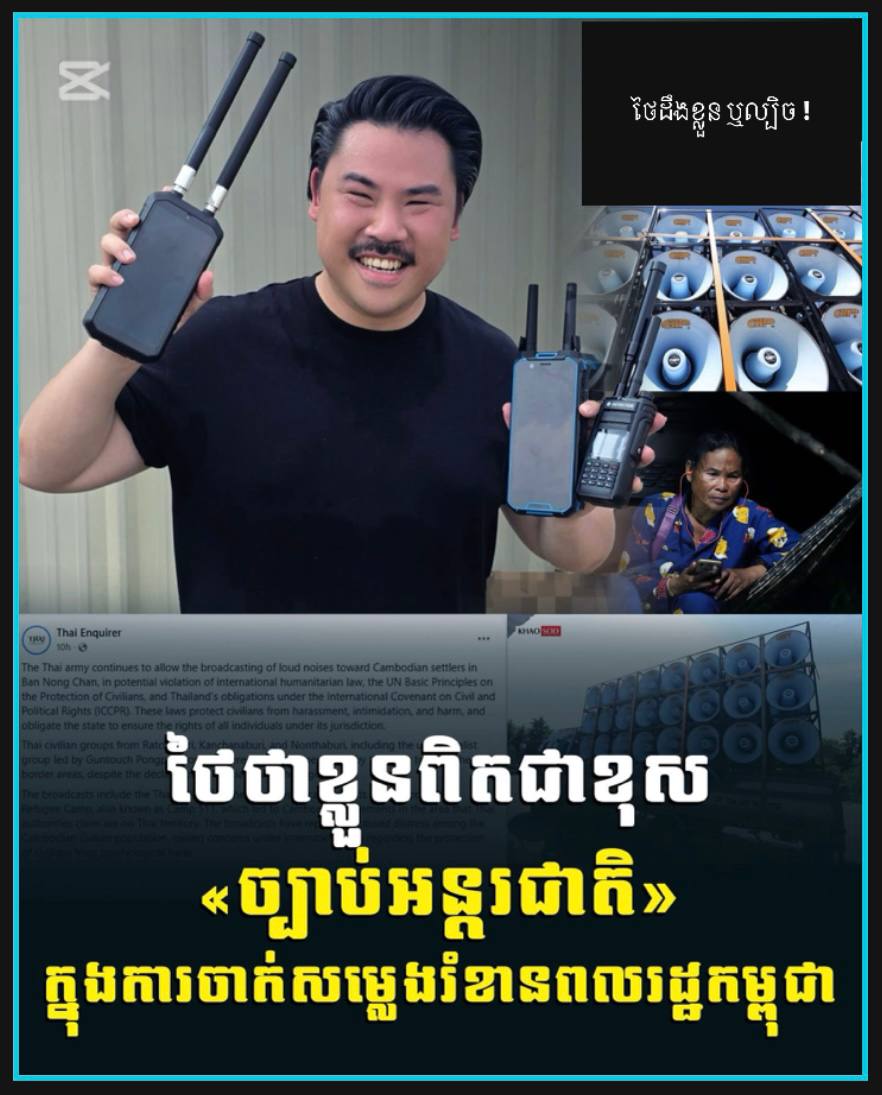 ថៃ៖ កាសែតថៃ Thai Enquirer បានរាយការណ៍ថាកងទ័ពថៃនៅតែបន្តអនុញ្ញាតឱ្យមានការចាក់សំឡេងខ្លាំងៗរខានដល់ពលរដ្ឋកម្ពុជានៅភូមិជោគជ័យ ឃុំអូរបីជាន់ ស្រុកអូរជ្រៅ ខេត្តបន្ទាយមានជ័យ ដោយនេះគឺជាការរំលោភបំពានច្បាប់មនុស្សធម៌អន្តរជាតិ គោលការណ៍ជាមូលដ្ឋានរបស់អង្គការសហប្រជាជាតិស្តីពីការការពារជនស៊ីវិល និងកាតព្វកិច្ចរបស់ប្រទេសថៃក្រោមកតិកាសញ្ញាអន្តរជាតិស្តីពីសិទ្ធិពលរដ្ឋ និងសិទ្ធិនយោបាយ (ICCPR)។ ច្បាប់ទាំងនេះការពារជនស៊ីវិលពីការយាយី ការបំភិតបំភ័យ និងការបង្កគ្រោះថ្នាក់ និងកាតព្វកិច្ចរដ្ឋក្នុងការធានាសិទ្ធិរបស់បុគ្គលទាំងអស់ដែលស្ថិតនៅក្រោមយុត្តាធិការរបស់ច្បាប់។