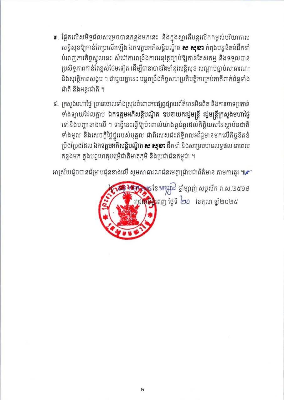 ២. ក្នុងនាមជាសេនាធិការរបស់រាជរដ្ឋាភិបាល នីតិកាលទី៧ នៃរដ្ឋសភា ដែលមាន សម្តេច មហាបវរធិបតី ហ៊ុន ម៉ាណែត នាយករដ្ឋមន្ត្រី ជាប្រមុខ លោកអភិសន្តិបណ្ឌិត ស សុខា បាននិងកំពុងខិតខំប្រឹងប្រែងប្រកបដោយឆន្ទៈ និងមិនខ្លាចនឿយហត់ ក្នុងការ សម្របសម្រួលដឹកនាំរដ្ឋបាលថ្នាក់ក្រោមជាតិ និងការគ្រប់គ្រងថែរក្សាសន្តិសុខ សណ្តាប់ធ្នាប់ សាធារណៈ សំដៅទប់ស្កាត់ និងលុបបំបាត់បទល្មើសគ្រប់ប្រភេទ ជាអាទិ៍ បទល្មើសបច្ចេកវិទ្យា, អំពើជួញដូរមនុស្សគ្រប់ទម្រង់, បទល្មើសជួញដូរគ្រឿងញៀន ទទួលបានលទ្ធផលល្អប្រសើរ ជាបន្តបន្ទាប់ រួមចំណែកដល់ការអភិវឌ្ឍប្រទេសជាតិលើគ្រប់វិស័យ ។ ជាក់ស្តែង ក្នុងរយៈ ពេល ៩ខែ ឆ្នាំ២០២៥ ក្រោមការយកចិត្តទុកដាក់ និងការដឹកនាំបញ្ជាផ្ទាល់ពី លោកអភិសន្តិបណ្ឌិត ស សុខា អាជ្ញាធរ និងកងកម្លាំងមានសមត្ថកិច្ចបានស្រាវជ្រាវ និងបង្ក្រាប បទល្មើសឆបោកតាមប្រព័ន្ធបច្ចេកវិទ្យា (Online Scam) ៤៨ លើក (ឃាត់ខ្លួនបញ្ជូន ទៅតុលាការ ១៦៨នាក់ និងបណ្តេញចេញពីកម្ពុជា ២.៧២២នាក់), បទល្មើសជួញដូរមនុស្ស ១៤៧ ករណី (ឃាត់ខ្លួន ២០៥នាក់ កសាងសំណុំរឿងបញ្ជូនទៅតុលាការ និងរំដោះ ជនរងគ្រោះ ៤៨៣នាក់), បទល្មើសគ្រឿងញៀន ៦.៩១៤ករណី (ឃាត់ខ្លួនអ្នកពាក់ព័ន្ធ ១៧.៤០៦នាក់ រឹបអូសគ្រឿងញៀនគ្រប់ប្រភេទបានប្រមាណ ៧តោន និង ៥០៩គ.ក ព្រមទាំងសារធាតុគីមីផ្សំ ប្រមាណ ៤៨តោន) ។