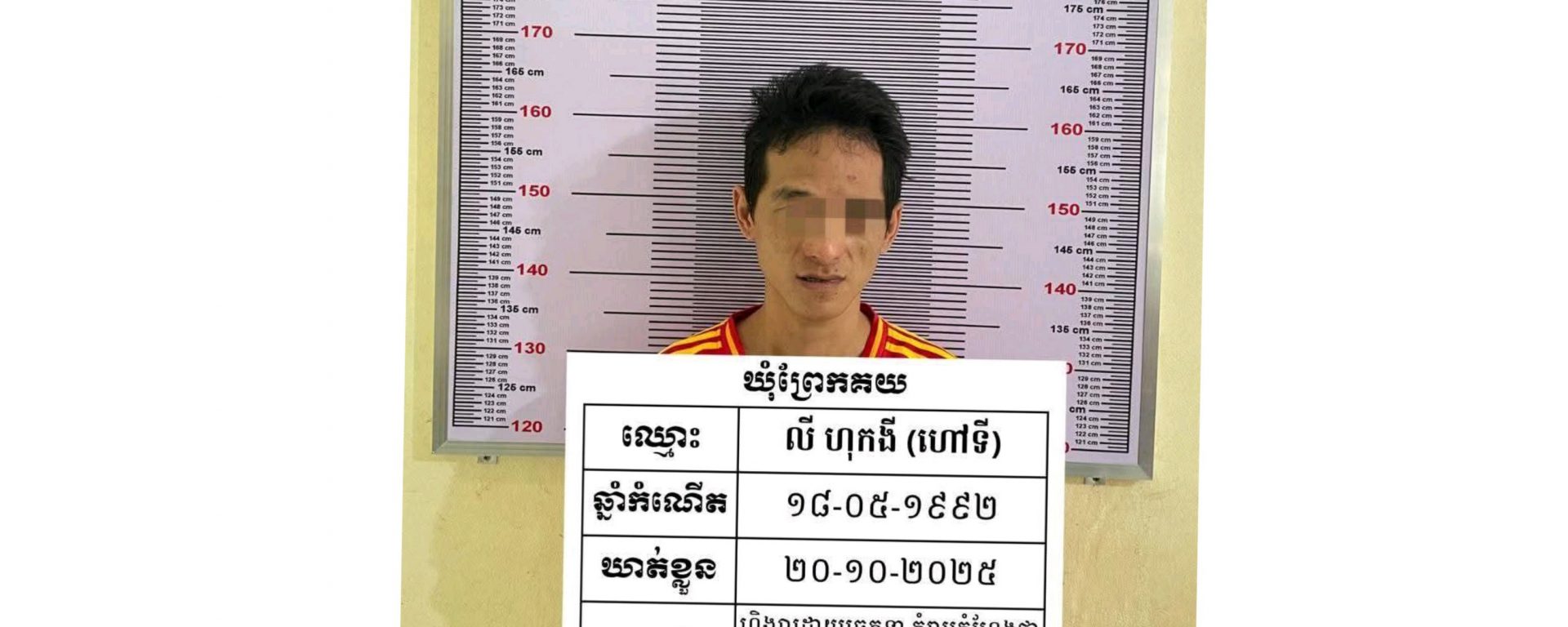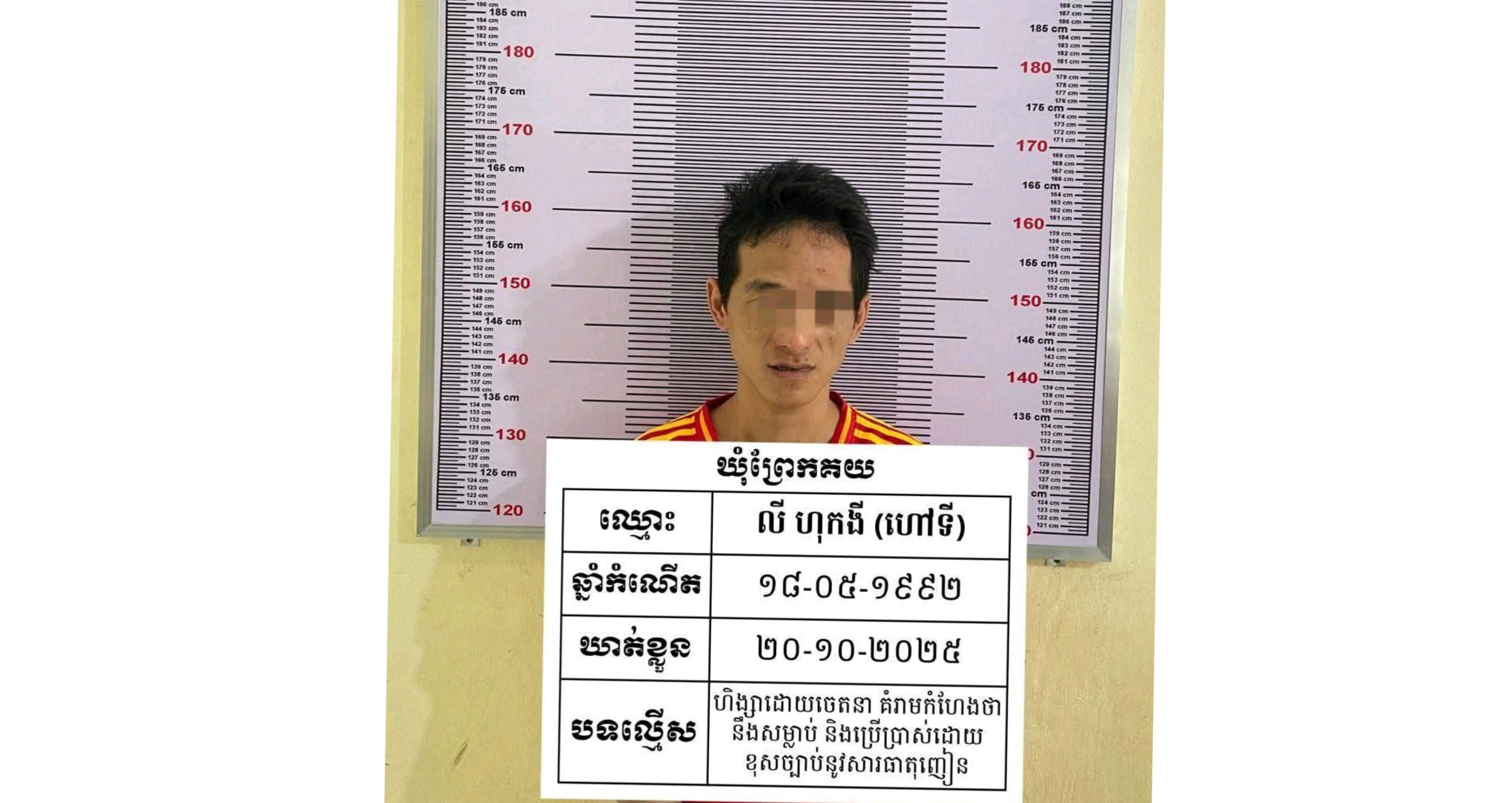 រីឯជនសង្ស័យត្រូវបានឃាត់ខ្លួនឈ្មោះ លី ហុកងី ហៅទី ភេទប្រុស អាយុ ៣៣ឆ្នាំ ជនជាតិខ្មែរ មុខរបរមិនពិត ប្រាកដមានទីលំនៅភូមិព្រែកតាជ្រូក ឃុំព្រែកគយ ស្រុក ស្អាង ត្រូវជាកូនបង្កើតមានសារធាតុញៀនវិជ្ជមាន(+) ហើយ ធ្លាប់ជាប់ពន្ធនាគារខេត្តកណ្តាលចំនួន០១លេីក ពីបទ÷ គំរាមកំហែងថា និងសម្លាប់ និងធ្វើឲ្យខូចខាតដោយចេតនា រយៈពេល០១ឆ្នាំ។