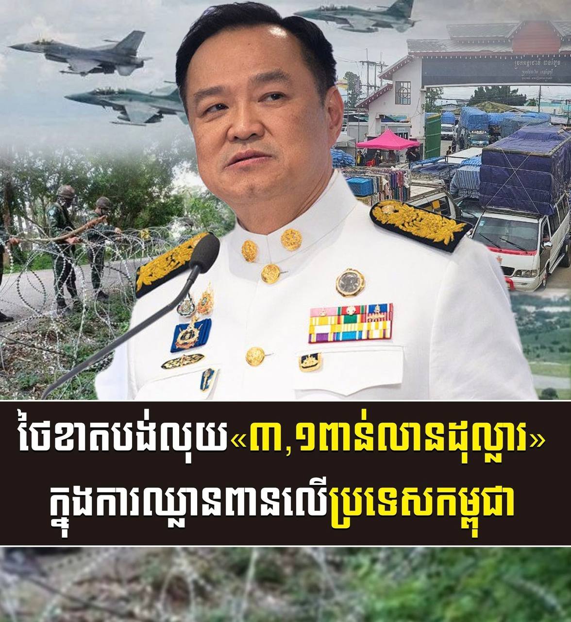 ប្រទេសថៃ៖ រដ្ឋាភិបាលរបស់នាយករដ្ឋមន្ត្រីថៃដឹកនាំដោយ លោក Anutin Charnvirakul ព្យាករណ៍ថា ថៃកំពុងតែរងការខាតបង់ទឹកលុយសេដ្ឋកិច្ចដល់ទៅ ១០០ ពាន់លានបាត (៣.១ ពាន់លានដុល្លារ) ពីការប៉ះពាល់ពាណិជ្ជកម្មឆ្លងព្រំដែនជាមួយប្រទេសកម្ពុជា ចាប់តាំងពីថៃបានបើកការឈ្លានពានមកលើប្រទេសកម្ពុជាកាលពីចុងខែកក្កដាមក។ នេះបើយោងតាមការចេញផ្សាយដោយកាសែត Bloomberg ។