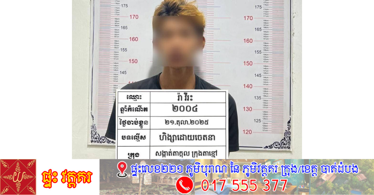 ខេត្តកណ្តាល÷ជនសង្ស័យជាមុខសញ្ញាចាស់ដែលធ្លាប់មានប្រវត្តិជាប់ពន្ធនាគារចំនួន២លើករួចមកហើយបាន បន្តបង្កអំពើហិង្សាដោយចេតនា កាន់កាប់កាំបិតផ្គាក់កាប់ប្រហារទៅលើជនរងគ្រោះបណ្ដាលឲ្យរងរបួសដេរអស់ ១២ថ្នេរ។ ហេតុការណ៍នេះកើតឡើងកាលពីយប់ថ្ងៃទី១៩ ខែតុលា ឆ្នាំ២០២៥ នៅចំណុចភូមិព្រែកកាត់ សង្កាត់តាក្តុល ក្រុងតាខ្មៅ ហើយជនសង្ស័យត្រូវបានសមត្ថកិច្ចឃាត់ខ្លួនបាននៅថ្ងៃទី២១ ខែតុលា ឆ្នាំ ២០២៥ រួមទាំងវត្ថុតាង។