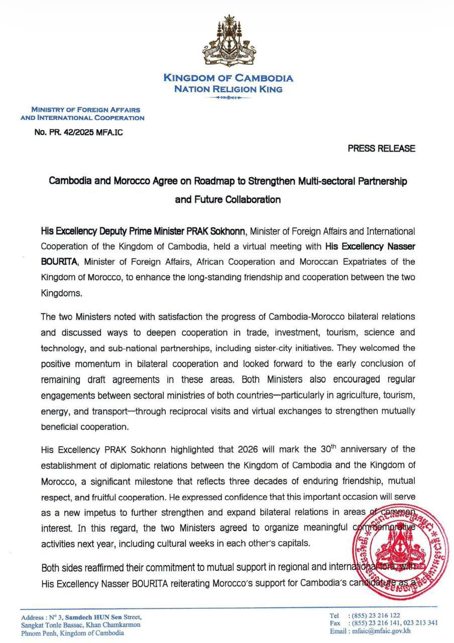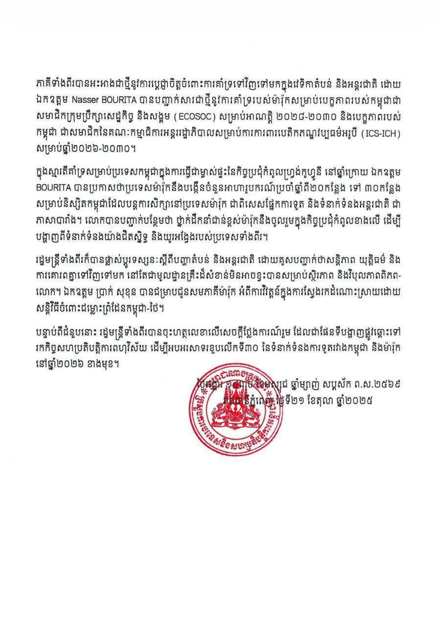 បន្ទាប់ពីជំនួបនោះ រដ្ឋមន្ត្រីទាំងពីរបានចុះហត្ថលេខាលើសេចក្តីថ្លែងការណ៍រួម ដែលជាផែនទីបង្ហាញផ្លូវឆ្ពោះទៅ រកកិច្ចសហប្រតិបត្តិការពហុវិស័យ ដើម្បីអបអរសាទរខួបលើកទី៣០ នៃទំនាក់ទំនងការទូតរវាងកម្ពុជា និងម៉ារ៉ុក នៅឆ្នាំ២០២៦ ខាងមុខ៕