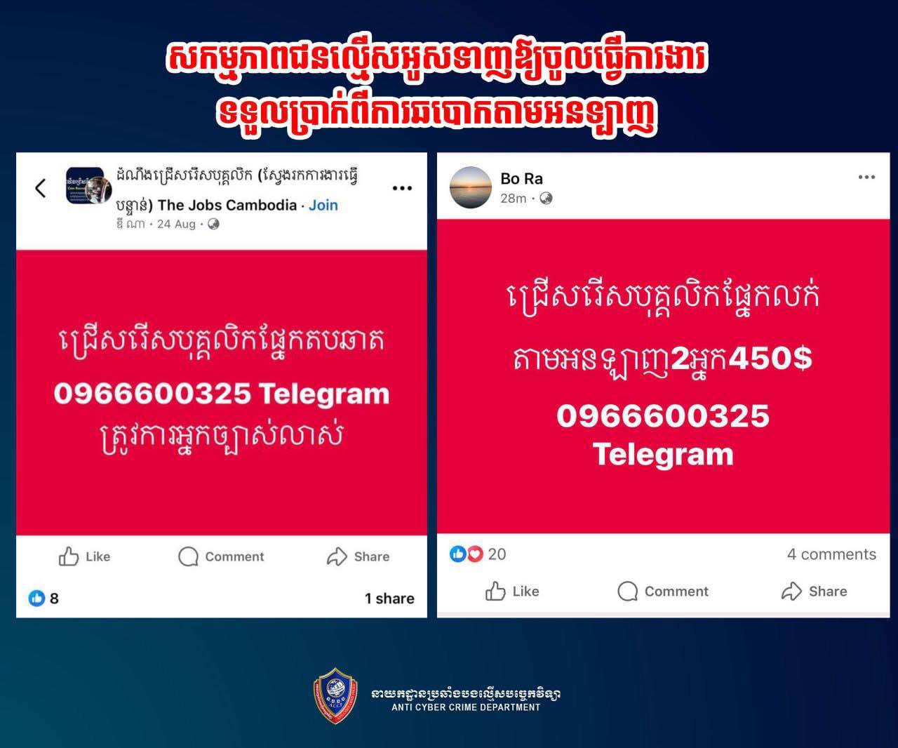 ជាមួយគ្នានោះ នាយកដ្ឋាន សូមក្រើនរំលឹកដល់សារធារណជន សូមប្រុងប្រយ័ត្នខ្ពស់ ពីការផ្ដល់ឱកាសការងារតាមអនឡាញដែលមិនស្គាល់ប្រភពច្បាស់លាស់ អាចត្រូវបានជនអនាមិកបញ្ចុះបញ្ចូល អូសទាញ រហូតក្លាយជាអ្នកទទួលផលនៃបទល្មើសផ្សេងៗ និងត្រូវទទួលទោសតាមផ្លូវច្បាប់ជាធរមាន៕