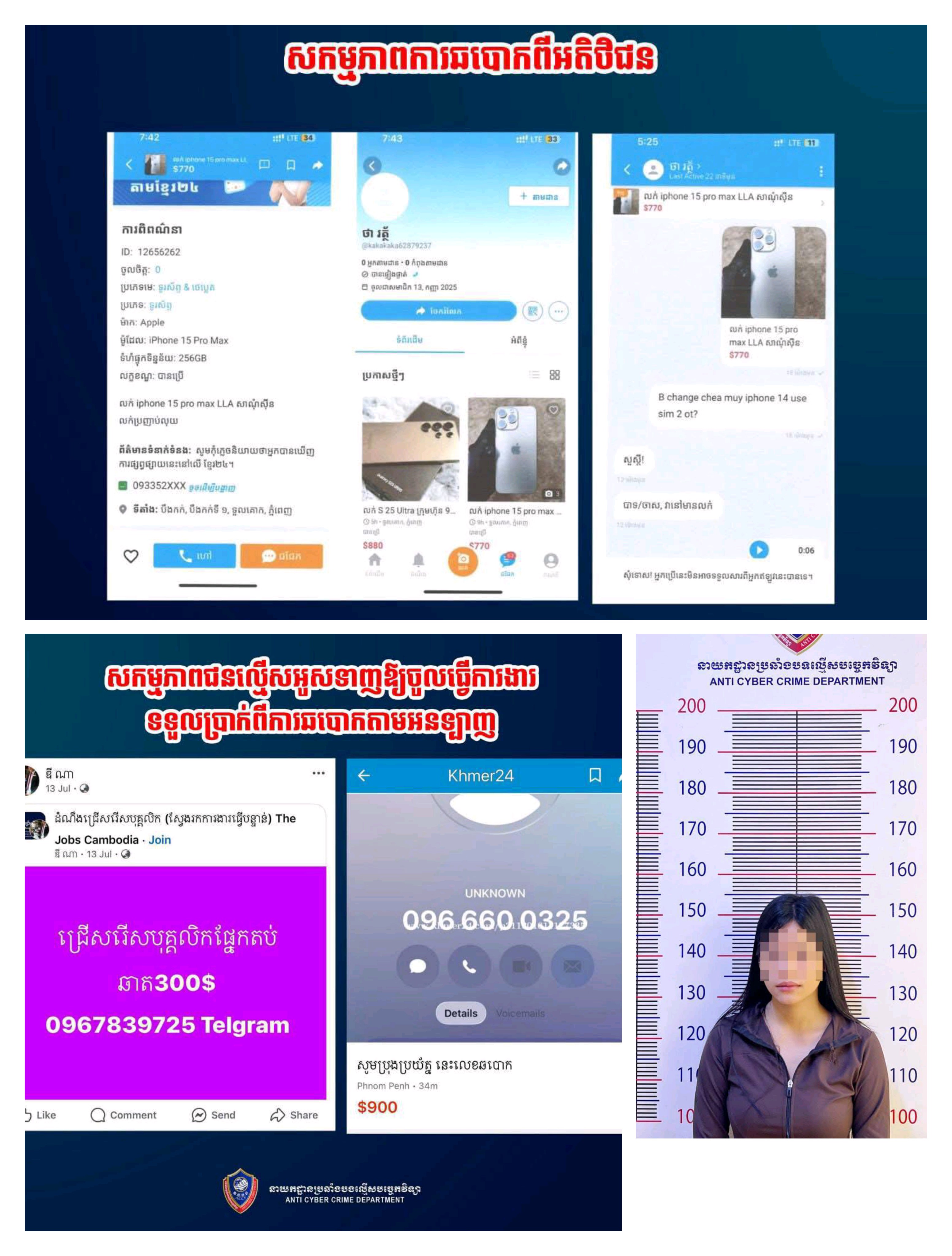 ភ្នំពេញ៖ យោងតាមបញ្ជាដឹកនាំរបស់ ឯកឧត្ដម នាយឧត្ដមសេនីយ៍ ស ថេត អគ្គស្នងការនគរបាលជាតិ និងតាមការចង្អុលណែនាំពី ឯកឧត្ដម ឧត្ដមសេនីយ៍ឯក អគ្គស្នងការរងនគរបាលជាតិ កាលពីថ្ងៃទី២១ ខែតុលា ឆ្នាំ២០២៥ នាយកដ្ឋានប្រឆាំងបទល្មើសបច្ចេកវិទ្យា បានបើកការស្រាវជ្រាវ និងបង្រ្កាបលើករណីឆបោកប្រាក់ក្រោមរូបភាពទិញ-លក់ទូរស័ព្ទតាមអនឡាញ ដែលមានជនរងគ្រោះជាច្រើននាក់ដែលបានដាក់ពាក្យបណ្ដឹង។