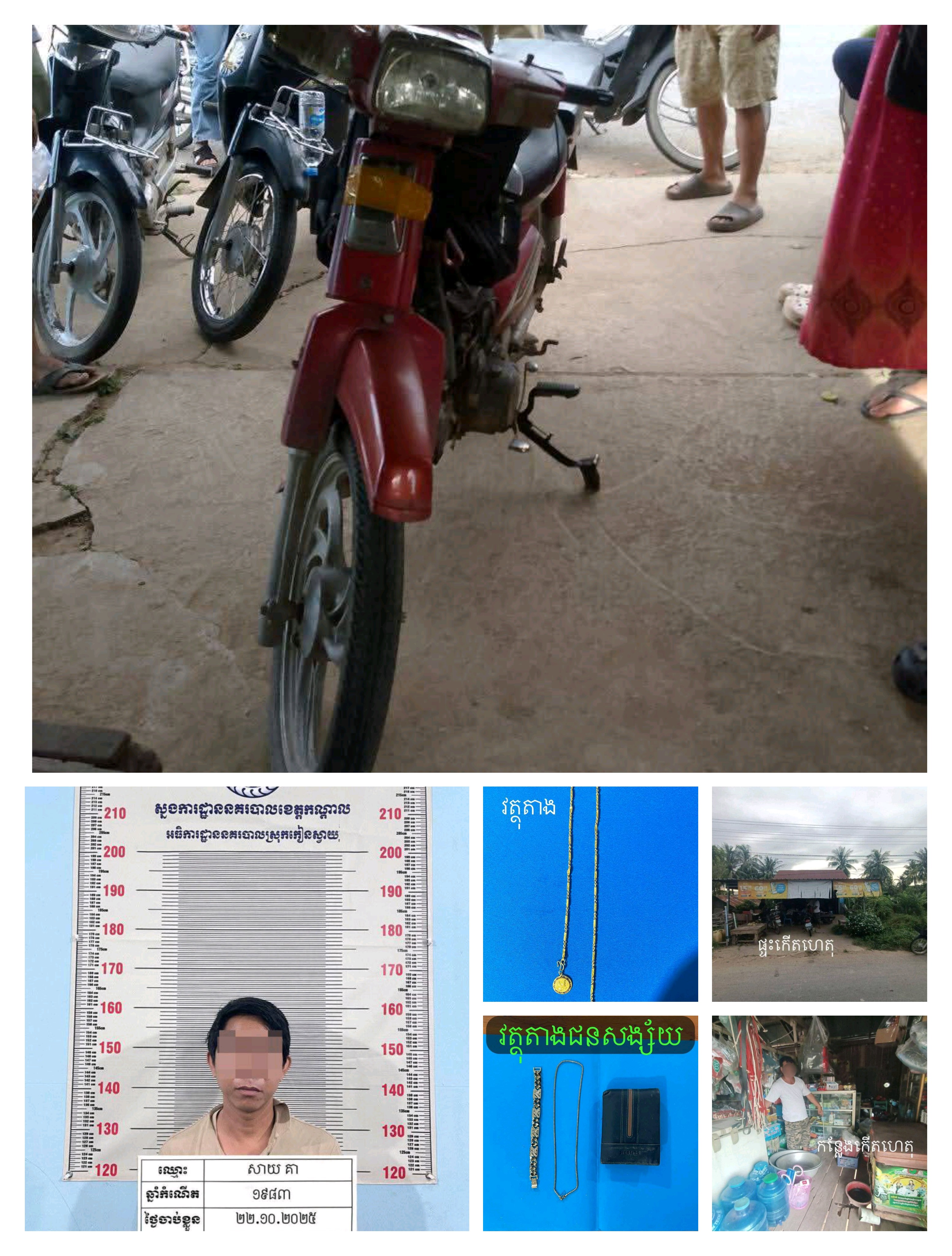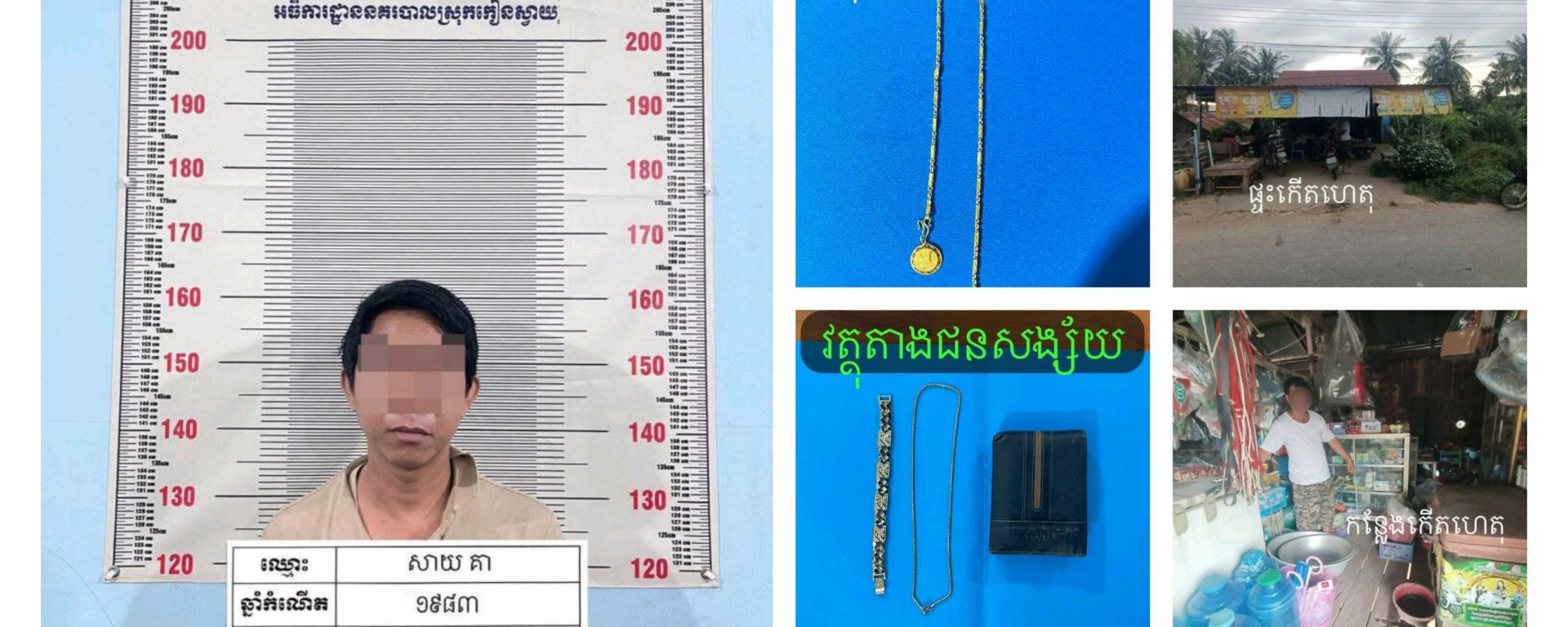 ផ្ទុបទៅនឹងក្តារ ហើយបានទាញផ្តាច់ខ្សែករបស់ជនរងគ្រោះ និងរត់គេចចេញពីកន្លែងកើតហេតុ ប៉ុន្តែត្រូវជនរងគ្រោះរត់ដេញតាមពីក្រោយដោយស្រែកថា ចោរៗ ឮដូចនេះអ្នកជិតខាងជូយដេញចាប់ជនសង្ស័យបាន និងរាយការញ៍ជូនសមត្ថកិច្ចនគរបាលប៉ុស្តិ៍រដ្ឋបាលសំរោងធំមកអន្តរាគមន៍នាំខ្លួនជនសង្ស័យយកទៅសាកសួរនៅប៉ុស្តិ៍។