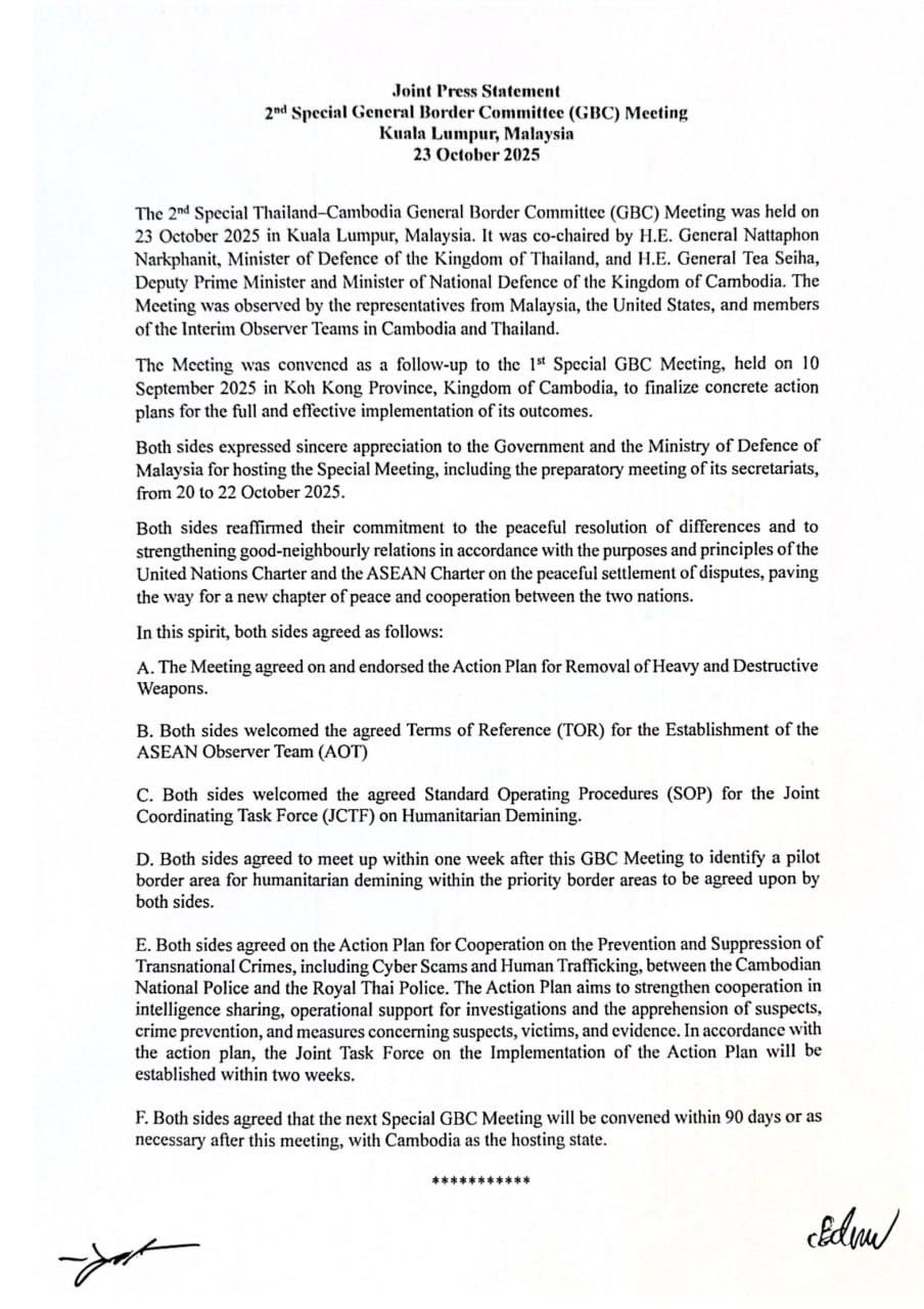 ភាគីទាំងពីរ បានសម្តែងនូវការថ្លែងអំណរគុណយ៉ាងជ្រាលជ្រៅ ជូនចំពោះរដ្ឋាភិបាល និងក្រសួងការពារ ជាតិរបស់ម៉ាឡេស៊ី ដែលបានទទួលរៀបចំកិច្ចប្រជុំពិសេសនេះ រួមទាំងកិច្ចប្រជុំត្រៀមរបស់ក្រុមលេខាធិការដ្ឋាន នៃគណៈកម្មាធិការព្រំដែនទូទៅកម្ពុជា-ថៃ ចាប់តាំងពីថ្ងៃទី២០ ដល់ថ្ងៃទី២២ ខែតុលា ឆ្នាំ២០២៥ ផងដែរ។