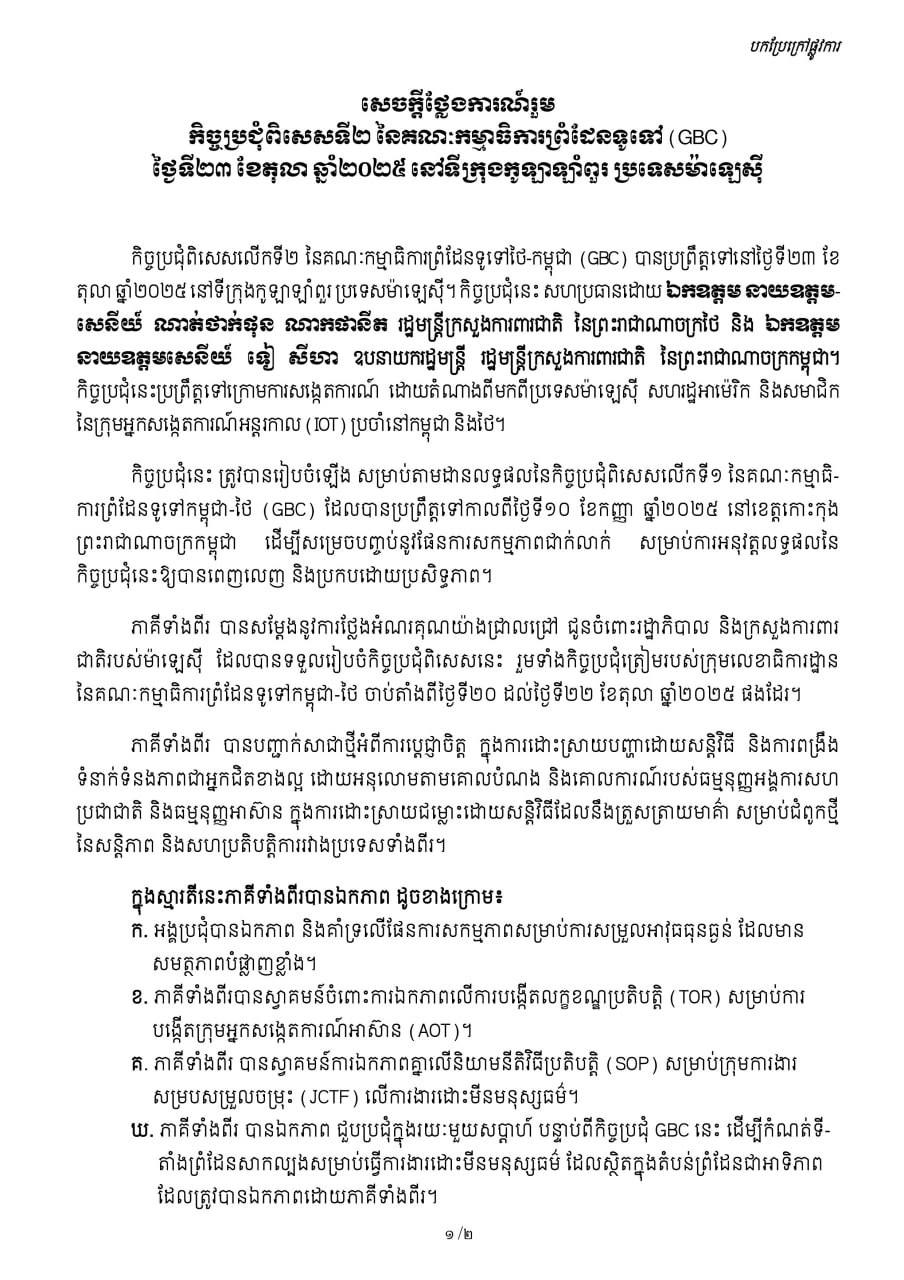 ម៉ាឡេស៊ី៖ កិច្ចប្រជុំពិសេសលើកទី២ នៃគណៈកម្មាធិការព្រំដែនទូទៅថៃ-កម្ពុជា (GBC) បានប្រព្រឹត្តទៅនៅថ្ងៃទី២៣ ខែ តុលា ឆ្នាំ២០២៥ នៅទីក្រុងកូឡាឡាំពួរ ប្រទេសម៉ាឡេស៊ី។ កិច្ចប្រជុំនេះ សហប្រធានដោយ ឯកឧត្តម នាយឧត្តម- សេនីយ៍ ណាត់ថាក់ផុន ណាកផានីត រដ្ឋមន្ត្រីក្រសួងការពារជាតិ នៃព្រះរាជាណាចក្រថៃ និង ឯកឧត្តម នាយឧត្តមសេនីយ៍ ទៀ សីហា ឧបនាយករដ្ឋមន្ត្រី រដ្ឋមន្ត្រីក្រសួងការពារជាតិ នៃព្រះរាជាណាចក្រកម្ពុជា។ កិច្ចប្រជុំនេះប្រព្រឹត្តទៅក្រោមការសង្កេតការណ៍ ដោយតំណាងពីមកពីប្រទេសម៉ាឡេស៊ី សហរដ្ឋអាម៉េរិក និងសមាជិក នៃក្រុមអ្នកសង្កេតការណ៍អន្តរកាល (IOT) ប្រចាំនៅកម្ពុជា និងថៃ។