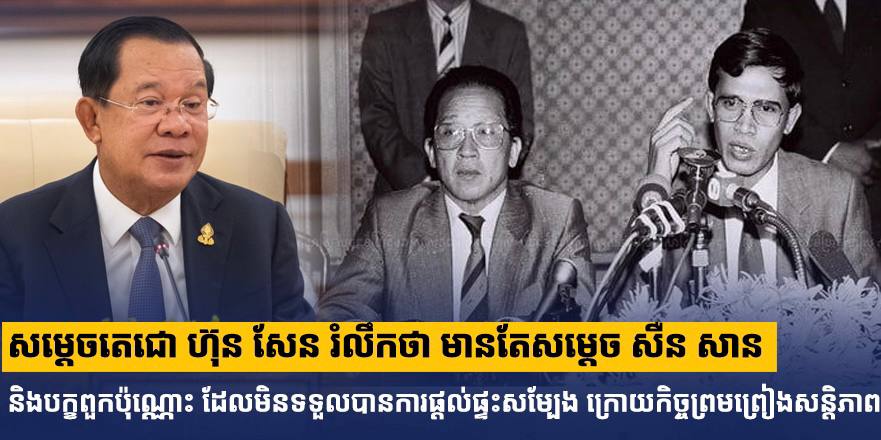 ភ្នំពេញ៖ ថ្លែងនៅក្នុងកិច្ចប្រជុំព្រឹទ្ធសភា នីតិកាលទី៥ សម័យប្រជុំលើកទី៤ នាថ្ងៃទី២៤ ខែតុលា ឆ្នាំ២០២៥ សម្ដេចអគ្គមហាសេនាបតីតេជោ ហ៊ុន សែន ប្រធានព្រឹទ្ធសភាកម្ពុជា បានថ្លែងរំលឹកថា មានតែសម្តេច សឺន សាន និងបក្ខពួកប៉ុណ្ណោះ ដែលមិនទទួលបានការផ្តល់ផ្ទះសម្បែង ក្រោយពីត្រឡប់មកពីចូលរួមកិច្ចព្រមព្រៀងសន្តិភាពទីក្រុងប៉ារីស ដែលជាកិច្ចព្រមព្រៀងស្តីពីដំណោះស្រាយនយោបាយរួមនៃជម្លោះកម្ពុជា ដែលត្រូវបានបង្កើតឡើងនៅថ្ងៃទី២៣ ខែតុលា ឆ្នាំ១៩៩១។