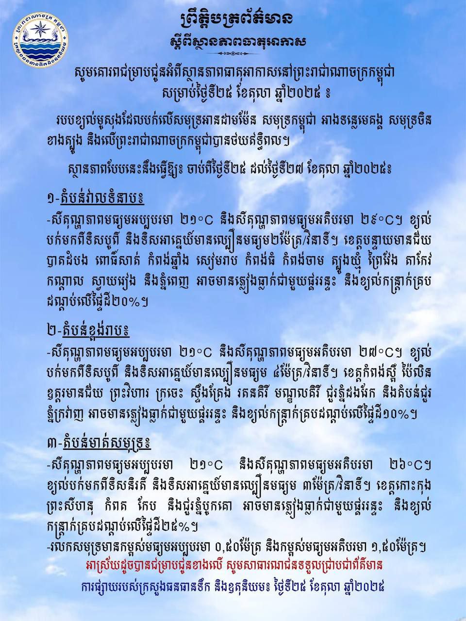 សូមគោរពជម្រាបជូនអំពីស្ថានភាពធាតុអាកាសនៅព្រះរាជាណាចក្រកម្ពុជា សម្រាប់ថ្ងៃទី២៥ ខែតុលា ឆ្នាំ២០២៥ ៖