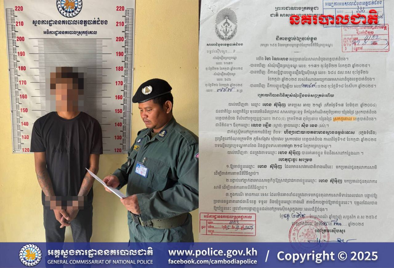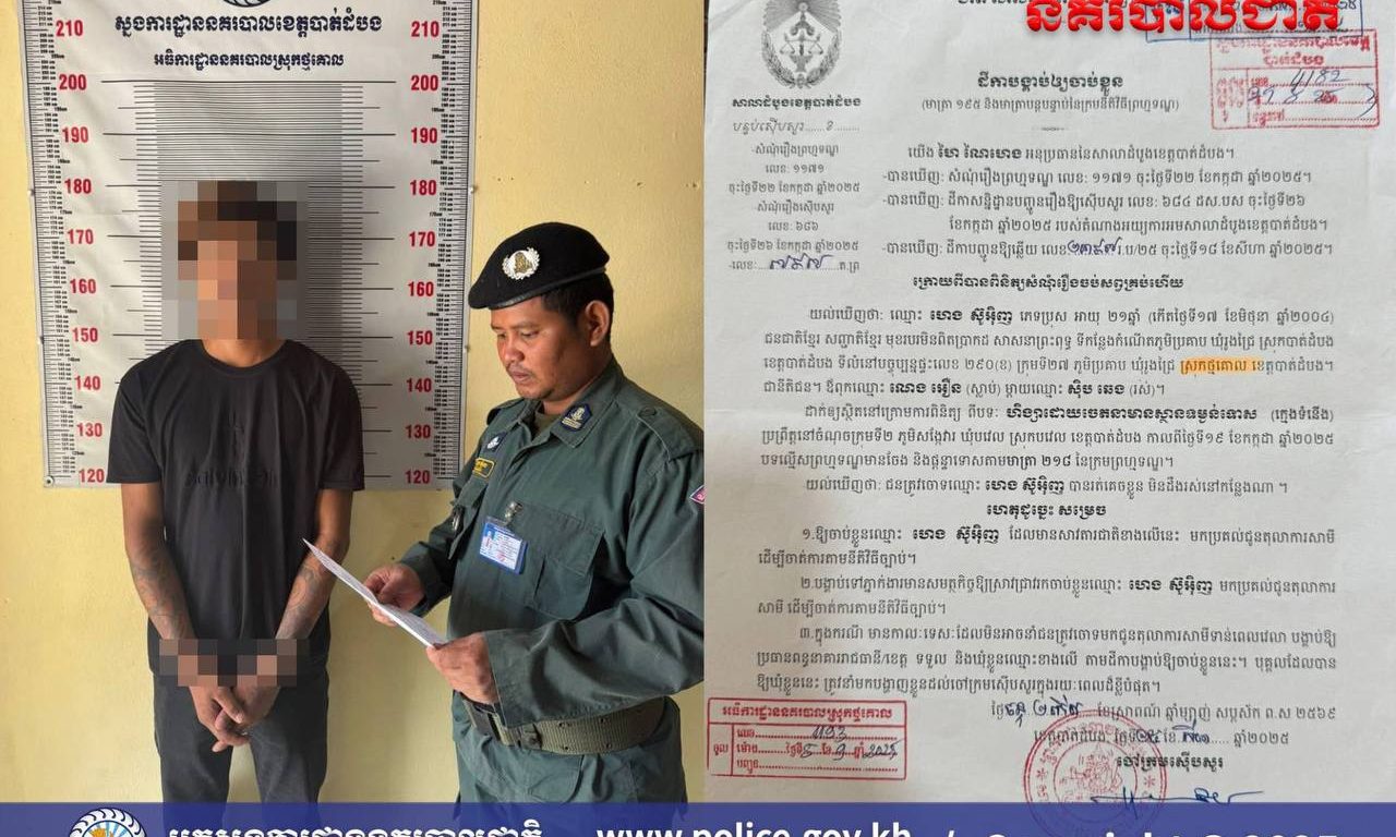 ខេត្តបាត់ដំបង ៖ នៅថ្ងៃទី២៥ ខែតុលា ឆ្នាំ២០២៥ វេលាម៉ោង០៩និង២០នាទី នៅចំណុចក្រុមទី២៧ ភូមិប្រគាប ឃុំរូងជ្រៃ ស្រុកថ្មគោល ខេត្តបាត់ដំបង កម្លាំងផ្នែកជំនាញនគរបាលយុត្តិធម៌ នៃអធិការដ្ឋាននគរបាលស្រុកថ្មគោល ដឹកនាំដោយលោកវរសេនីយ៍ឯក សេង លុច អធិការនគរបាលស្រុកថ្មគោល បានចុះអនុវត្តដីកាបង្គាប់ឱ្យចាប់ខ្លួនលេខ ៧៩៧ ត.ព្រ ចុះថ្ងៃទី២៥ ខែ សីហា ឆ្នាំ២០២៥ របស់លោក ហៃ ណៃហេង ចៅក្រមស៊េីបសួរ នៃសាលាដំបូងខេត្តបាត់ដំបង ដែលបង្គាប់ឲ្យចាប់ខ្លួន-ឃុំខ្លួន ពិរុទ្ធជនម្នាក់ឈ្មោះ ហេង ស៊ូអ៉ិញ ភេទប្រុស អាយុ២២ឆ្នាំ មានទីលំនៅភូមិប្រគាបឃុំរូងជ្រៃ ស្រុកថ្មគោល ខេត្តបាត់ដំបង ពីបទហិង្សាដោយចេតនាមានស្ថានទម្ងន់ទោស (ក្មេងទំនេីង) ប្រព្រឹត្តនៅចំណុចក្រុមទី០៦២ ភូមិសង្កែវារ ឃុំបវេល ស្រុកបវេល ខេត្តបាត់ដំបង កាលពីថ្ងៃទី ១៩ ខែ កក្កដា ឆ្នាំ២០២៥ បទល្មេីសព្រហ្មទណ្ឌដែលមានចែងនិងផ្តន្ទាទោស តាមមាត្រា២១៨ នៃក្រមព្រហ្មទណ្ឌ ។