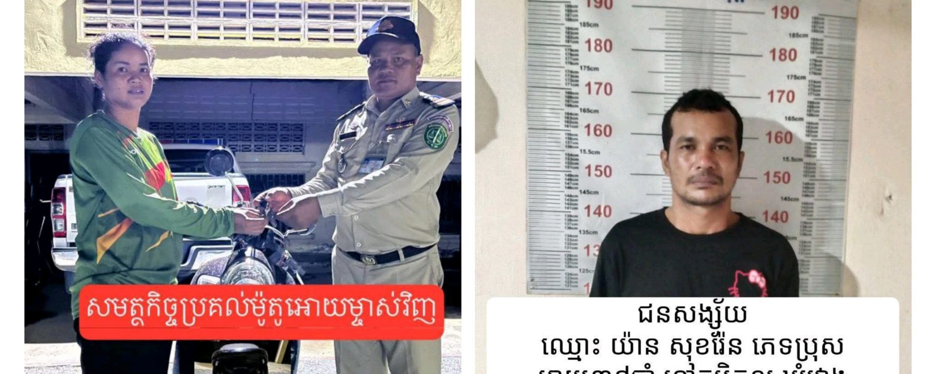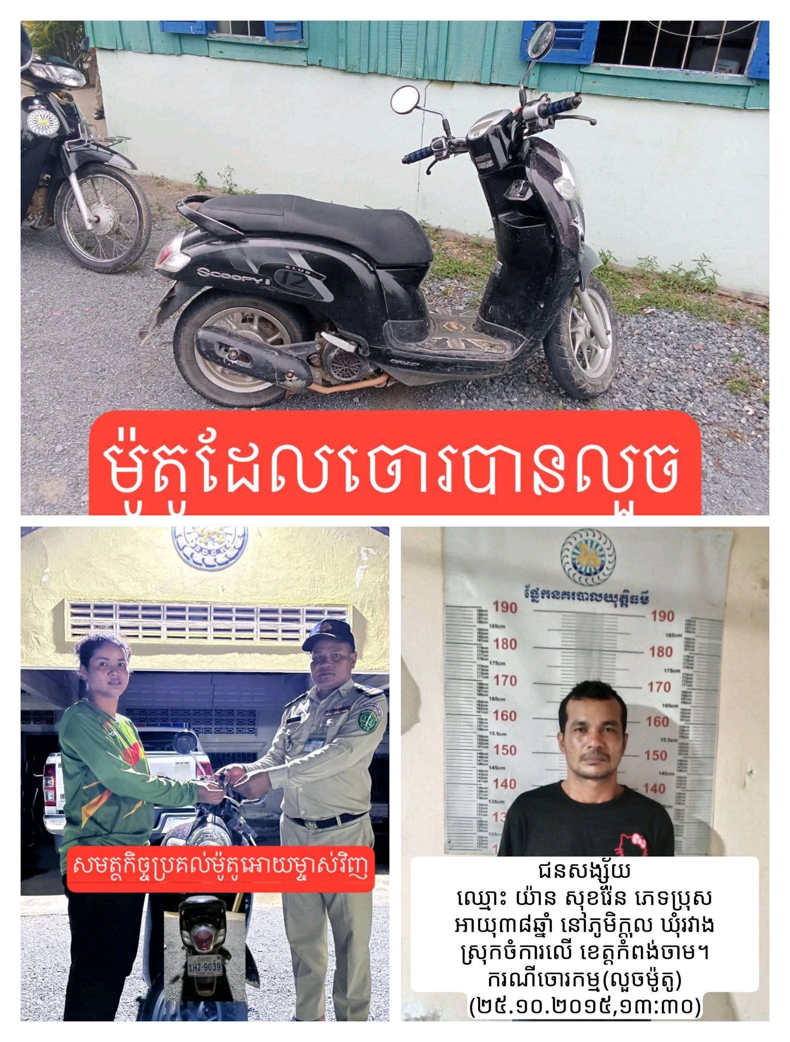ជនសង្ស័យមានឈ្មោះ យ៉ាន សុខ រ៉ែន ភេទប្រុស អាយុ ៣៨ឆ្នាំ មុខរបរមិនពិតប្រាកដ រស់នៅភូមិក្តុល ឃុំរវាង ស្រុកចំការលើ ខេត្តកំពង់ចាម បច្ចុប្បន្នមកជួលផ្ទះស្នាក់នៅក្នុងរាជធានី.ភ្នំពេញ ។ វត្ថុតាងដកហូតបានម៉ូតូ SCOOPY ពណ៌ខ្មៅមួយគ្រឿង ផ្លាកលេខ1H 9039 សមត្ថកិច្ចនគរបាលបានការអនុញ្ញាតប្រគល់