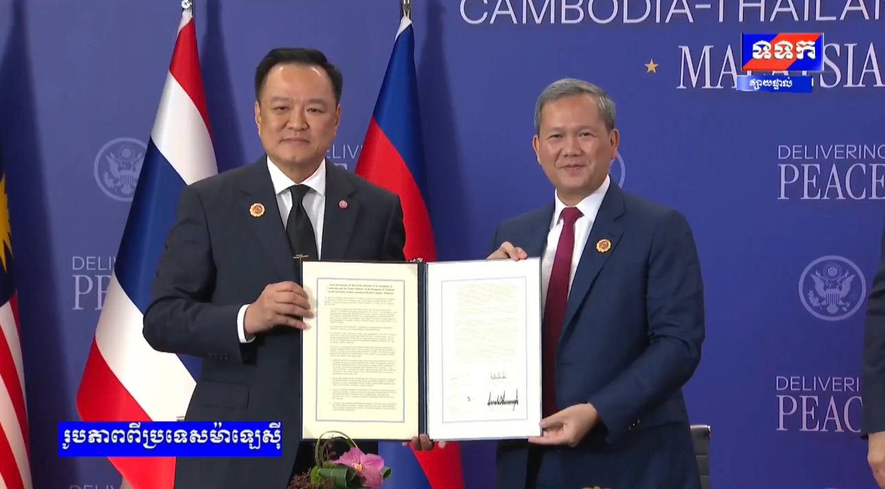 ថ្ងៃនេះត្រូវបានកត់ត្រាជាព្រឹត្តិការណ៍ប្រវត្តិសាស្ត្រដ៏មានសារៈសំខាន់ជាសារវ័ន្ត សម្រាប់កម្ពុជា និងថៃ ដែលបានបញ្ជាក់ឡើងវិញនូវការជឿជាក់រួមគ្នានៃប្រទេសយើងទាំងពីរថា សន្តិភាពនៅតែអាចមាន ដរាបណាប្រជាជាតិនានាមានសេចក្តីក្លាហាន និងសុភវិនិច្ឆ័យក្នុងការបន្តស្វែងរកសន្តិភាពជាមួយគ្នា។