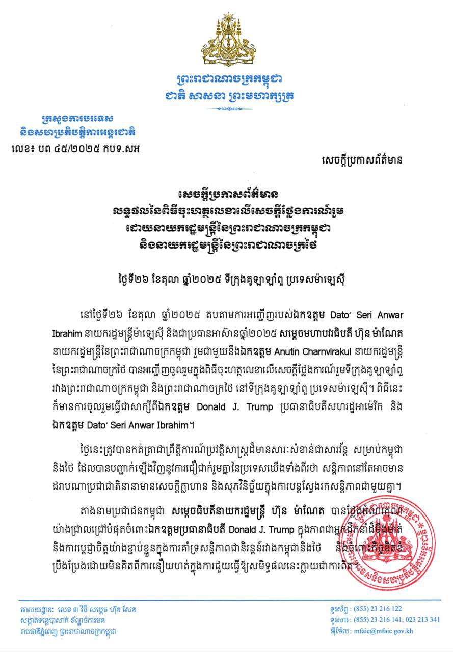 ទីក្រុងគូឡាឡាំពួ ប្រទេសម៉ាឡេស៊ី៖​ ក្រសួង​ការបរទេស​ និង​សហប្រតិបត្តិការ​អន្តរជាតិ​ បានបញ្ជាក់ថា​ នៅថ្ងៃទី២៦ ខែតុលា ឆ្នាំ២០២៥ តបតាមការអញ្ជើញរបស់ឯកឧត្តម Dato’ Seri Anwar Ibrahim នាយករដ្ឋមន្ត្រីម៉ាឡេស៊ី និងជាប្រធានអាស៊ានឆ្នាំ២០២៥ សម្តេចមហាបវរធិបតី ហ៊ុន ម៉ាណែត នាយករដ្ឋមន្ត្រីនៃព្រះរាជាណាចក្រកម្ពុជា រួមជាមួយនឹងឯកឧត្តម Anutin Charnvirakul នាយករដ្ឋមន្ត្រី នៃព្រះរាជាណាចក្រថៃ បានអញ្ជើញចូលរួមក្នុងពិធីចុះហត្ថលេខាលើសេចក្តីថ្លែងការណ៍រួមទីក្រុងគូឡាឡាំពួ រវាងព្រះរាជាណាចក្រកម្ពុជា និងព្រះរាជាណាចក្រថៃ នៅទីក្រុងគូឡាឡាំពួ ប្រទេសម៉ាឡេស៊ី។ ពិធីនេះ ក៏មានការចូលរួមធ្វើជាសាក្សីពីឯកឧត្តម Donald J. Trump ប្រធានាធិបតីសហរដ្ឋអាម៉េរិក និង ឯកឧត្តម Dato’ Seri Anwar Ibrahim។