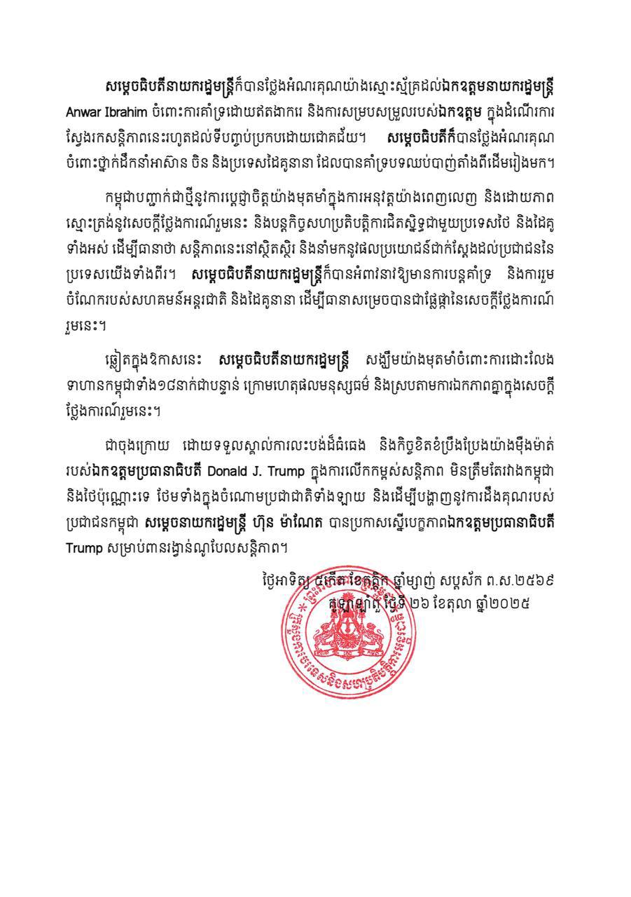 តាងនាមប្រជាជនកម្ពុជា សម្តេចធិបតីនាយករដ្ឋមន្ត្រី ហ៊ុន ម៉ាណែត​ បានថ្លែង​អំណរគុណ​ យ៉ាងជ្រាលជ្រៅបំផុតចំពោះឯកឧត្តមប្រធានាធិបតី Donald J. Trump ក្នុងភាពជាអ្នកដឹកនាំ​ដ៏​ម៉ឺងម៉ាត់​ និងការប្តេជ្ញាចិត្តយ៉ាងខ្ជាប់ខ្ជួនក្នុងការគាំទ្រសន្តិភាពជានិរន្តន៍រវាងកម្ពុជានិងថៃ នឹងចំពោះ​កិច្ចខំប្រឹងប្រែងដោយមិនគិតពីការនឿយហត់ក្នុងការជួយធ្វើឱ្យសមិទ្ធផលនេះក្លាយជាការពិត។