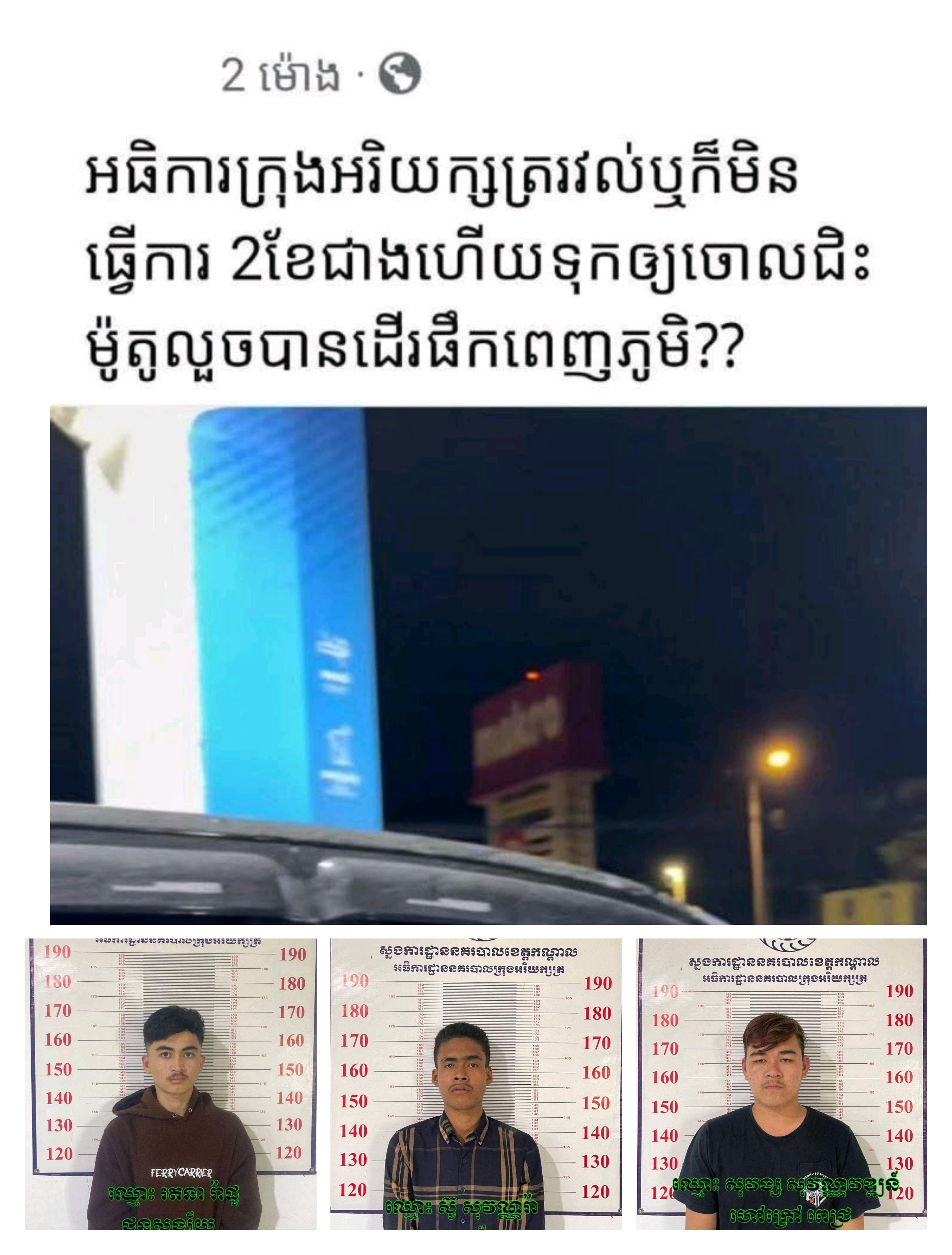 ពាក់ព័ន្ធករណីខាងលើនេះ ក្រោយពីទទួលបណ្តឹងពីជនរងគ្រោះ ឈ្មោះ ភាជ ភារម្យ ករណីអំពើលួចម៉ូតូ កាលពីថ្ងៃទី២៤ ខែសីហា ឆ្នាំ២០២៥ វេលាម៉ោង០៤: ០០នាទី ទៀបភ្លឺ រួចមក កម្លាំងប៉ុស្តិ៍នគរបាលរដ្ឋបាលព្រែកលួង បានសហការជាមួយកម្លាំងជំនាញព្រហ្មទណ្ឌ នៃអធិការដ្ឋាននគរបាលក្រុងអរិយក្សត្រ និងសហការជាមួយកម្លាំងប៉ុស្តិ៍នគរបាលរដ្ឋបាលវិហារសួគ៌ នៃអធិការដ្ឋាននគរបាលស្រុកខ្សាច់កណ្តាល បានធ្វើការស្រាវជ្រាវស្វែងរកជនសង្ស័យតាមនីតិវិធី។ រហូតថ្ងៃទី ២៦ ខែតុលា ឆ្នាំ២០២៥ វេលាម៉ោង ០៥:១៥នាទី ទៀប ភ្លឺ បានឃាត់ខ្លួនជនសង្ស័យពាក់ព័ន្ធ៣នាក់ រួមមាន៖