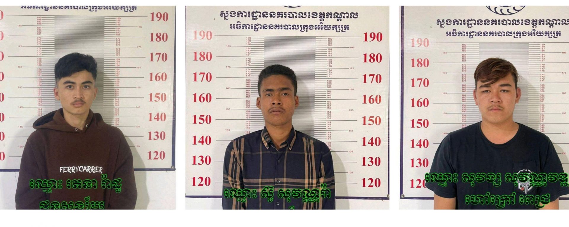 ១-ឈ្មោះ សុវង្ស សុវណ្ណវឌ្ឍន៍ ហៅក្រៅ ពេជ្រ ភេទប្រុស អាយុ២២ឆ្នាំ មានទីលំនៅភូមិព្រែកអំពិល សង្កាត់ព្រែកអំពិល ក្រុងអរិយក្សត្រ ខេត្តកណ្តាល,២- ឈ្មោះ ស៊ូ សវណ្ណរ៉ា ភេទប្រុស អាយុ១៨ឆ្នាំ មានទីលំនៅភូមិមេសរប្រចាន់លើ ឃុំមេសរប្រចាន់ ស្រុកពារាំង ខេត្តព្រៃវែងនិង៣-ឈ្មោះ រតនា រ៉ាដូ ភេទប្រុស អាយុ២០ឆ្នាំ មានទីលំនៅភូមិព្រែកលួង សង្កាត់ព្រែកលួង ក្រុងអរិយក្សត្រ ខេត្តកណ្តាល។