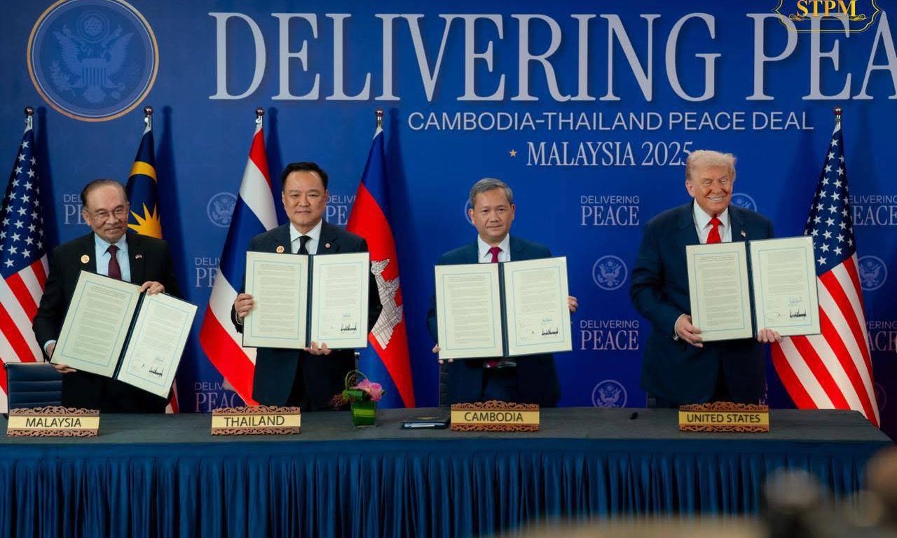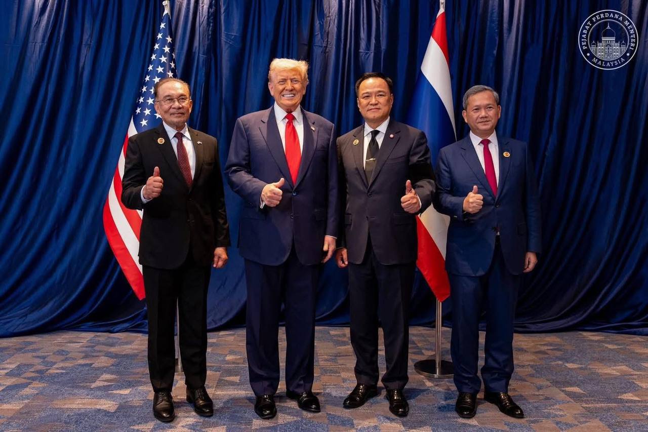 ម៉ាឡេស៊ី៖ សម្តេចមហាបវរធិបតី ហ៊ុន ម៉ាណែត នាយករដ្ឋមន្ត្រី នៃព្រះរាជាណាចក្រកម្ពុជា និងនាយករដ្ឋមន្ត្រី នៃព្រះរាជាណាចក្រថៃ និងដោយមានប្រធានាធិបតីសហរដ្ឋអាមេរិក និង នាយករដ្ឋមន្ត្រីម៉ាឡេស៊ី ធ្វើជាសាក្សី បន្ទាប់ពីបានប្រជុំគ្នានៅទីក្រុងគួឡាឡាំពួរ ប្រទេសម៉ាឡេស៊ី នៅថ្ងៃទី២៦ ខែតុលា ឆ្នាំ២០២៥នេះ បានឯកភាពគ្នា៨ចំណុច ដើម្បីស្តារ និងរក្សាទំនុកចិត្ត ការជឿទុកចិត្តគ្នាទៅវិញទៅមក និងសន្តិភាពតាមបណ្ដោយព្រំដែន។