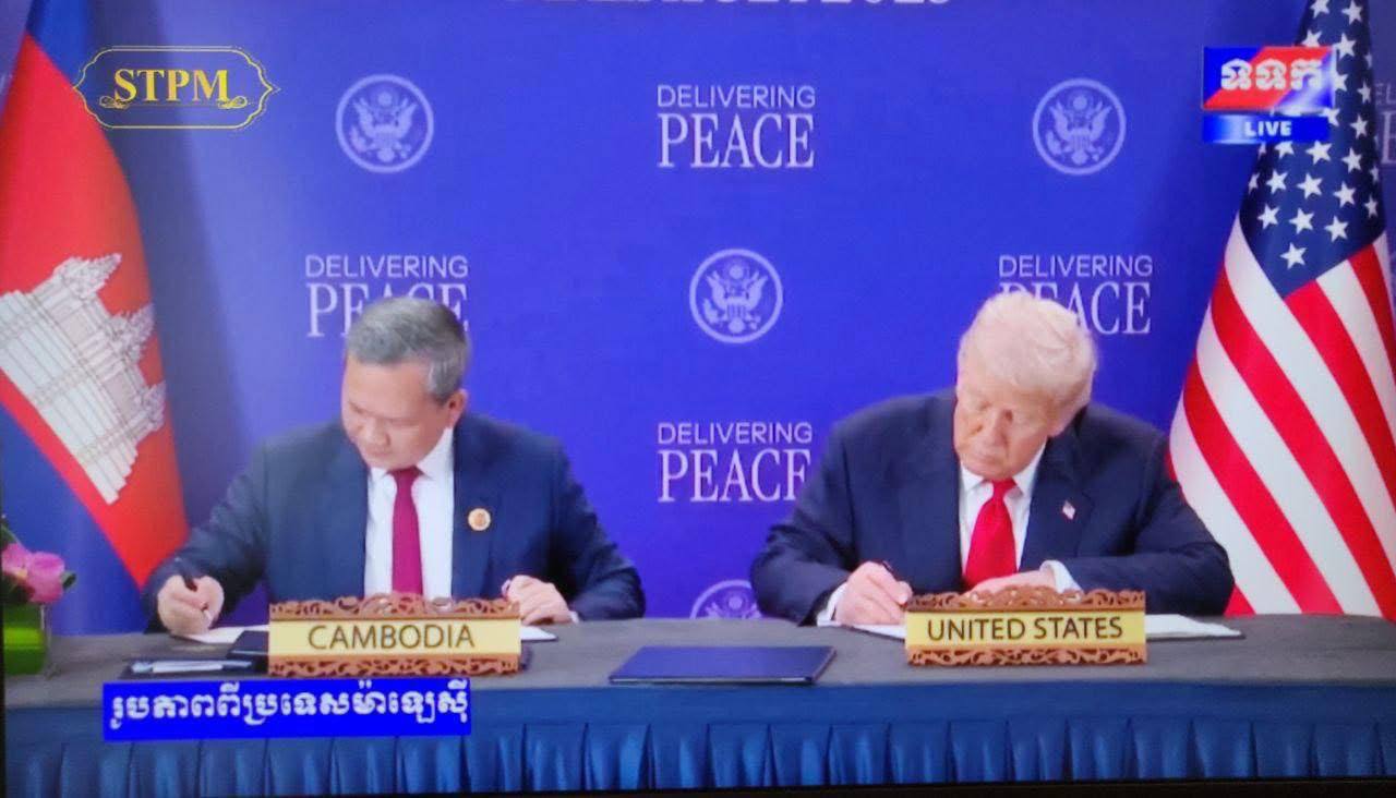 សម្ដេចធិបតីហ៊ុន ម៉ាណែត នាយករដ្ឋមន្រ្តីកម្ពុជា បានបង្ហោះរូបថតស្ដីពីពិធីចុះហត្ថលេខាលើកិច្ចព្រមព្រៀងពាណិជ្ជកម្មបដិការជាមួយលោក ត្រាំ ដោយលើកឡើងថា វានឹង «ពង្រឹង និងពង្រីកពាណិជ្ជកម្មទ្វេភាគី»។