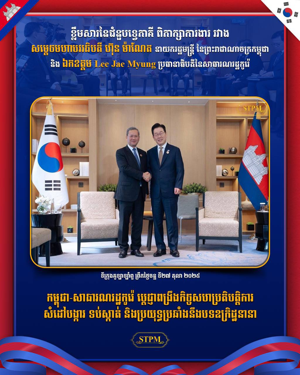 ម៉ាឡេស៊ី​៖​ នាព្រឹកថ្ងៃទី២៧ ខែតុលា ឆ្នាំ២០២៥, សម្តេចមហាបវរធិបតី ហ៊ុន ម៉ាណែត នាយករដ្ឋមន្រ្តី នៃព្រះរាជាណាចក្រកម្ពុជា និង ឯកឧត្តម Lee Jae-Myung ប្រធានាធិបតីសាធារណរដ្ឋកូរ៉េ បានជួបពិភាក្សាការងារទ្វេភាគី ក្នុងឱកាសចូលរួមកិច្ចប្រជុំកំពូលអាស៊ាន លើកទី៤៧ និងកិច្ចប្រជុំកំពូលពាក់ព័ន្ធ នៅទីក្រុងគូឡាឡាំពួ ប្រទេសម៉ាឡេស៊ី នៅថ្ងៃទី២៦-២៨ ខែតុលា ឆ្នាំ២០២៥។