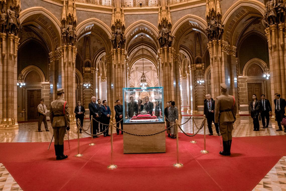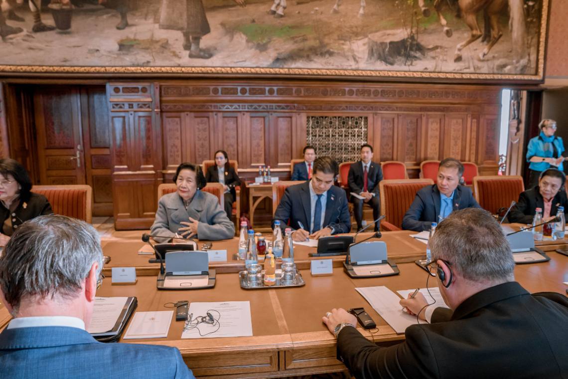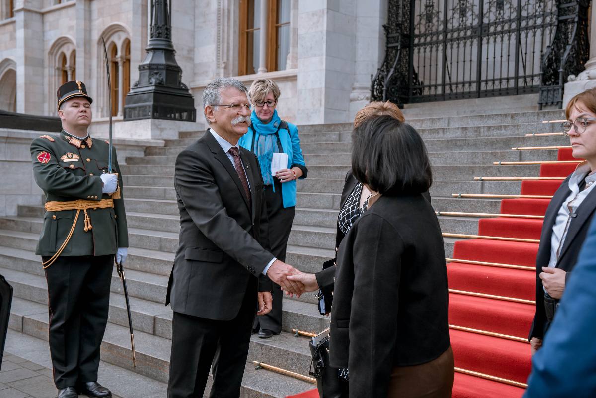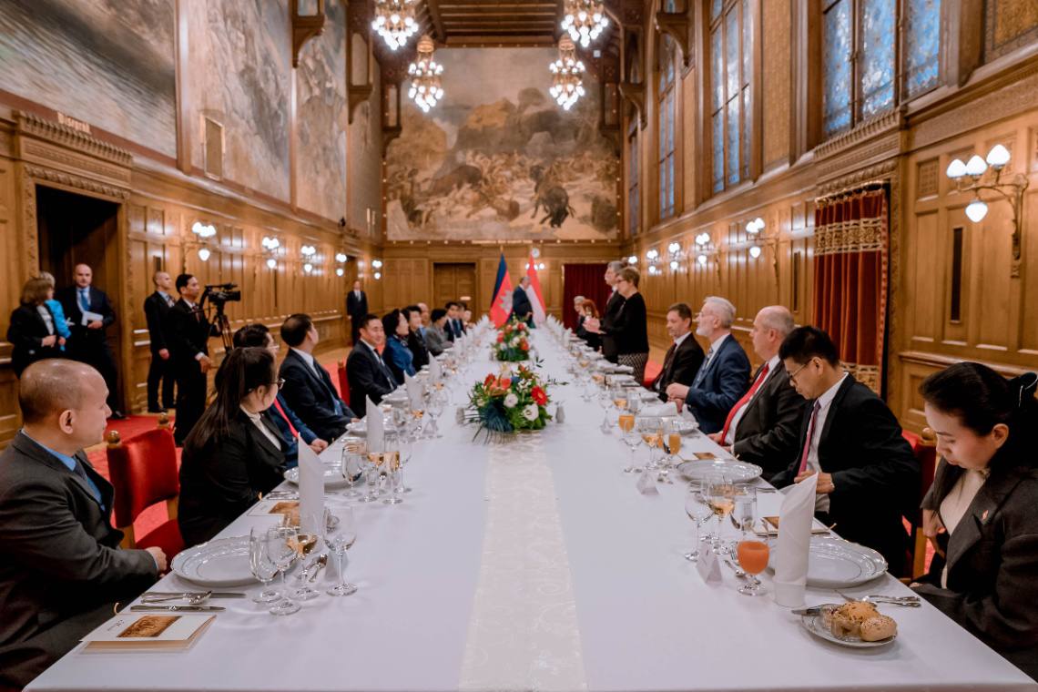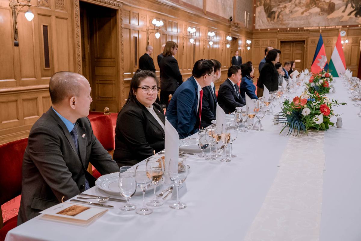 ប្រទេសហុងគ្រី៖ ក្រោយពីបញ្ចប់ជំនួបពិភាក្សាការងារទ្វេភាគី និងពិធីចុះហត្ថលេខាលើអនុស្សរណៈនៃការយោគយល់គ្នារវាងរដ្ឋសភាប្រទេសទំាងពីររួចមក នៅក្នុងថ្ងៃទី២៧ ខែតុលា ឆ្នាំ២០២៥នោះ លោក ឡាស្លូ កូវឺរ (László Kövér) ប្រធានរដ្ឋសភានៃប្រទេសហុងគ្រី បានរៀបចំពិធីលៀងសាយភោជន៍ អាហារថ្ងៃត្រង់ ស្វាគមន៍ជូនគណៈប្រតិភូរដ្ឋសភានៃព្រះរាជាណាចក្រកម្ពុជា នៅវិមានរដ្ឋសភាហុងគ្រី។