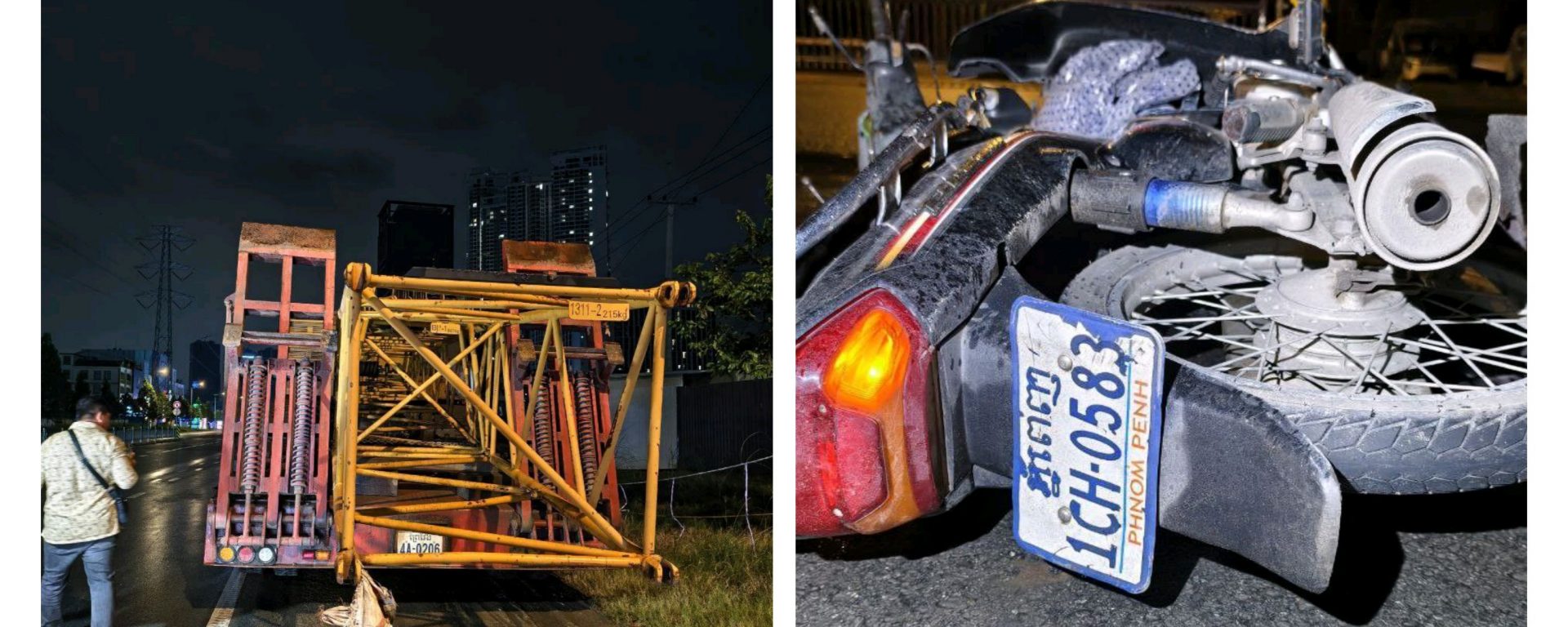 ភ្នំពេញ៖ បុរសម្នាក់បានជិះម៉ូតូទៅបុករថយន្តដឹកគ្រឿងចក្របណ្តាលឲ្យស្លាប់ភ្លាមៗនៅនឹងកន្លែងកេីតហេតុកាលពីវេលាម៉ោង ១២:៣០នាទីរំលងអធ្រាត្រ ឈានចូលថ្ងៃទី២៩ ខែតុលា ឆ្នាំ២០២៥ នៅតាមបណ្តោយផ្លូវ៦០ម៉ែត្រ សង្កាត់ចាក់អង្រែលើ ខណ្ឌមានជ័យ រាជធានីភ្នំពេញ។ ក្រោយកេីតហេតុអ្នកបេីកបររថយន្តធុនធំដឹកគ្រឿងចក្រ បានភ័យរត់គេចខ្លួនបាត់។