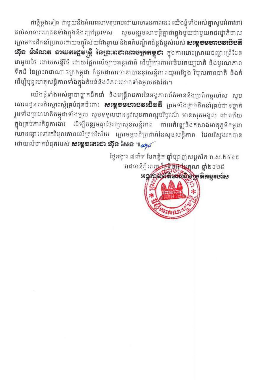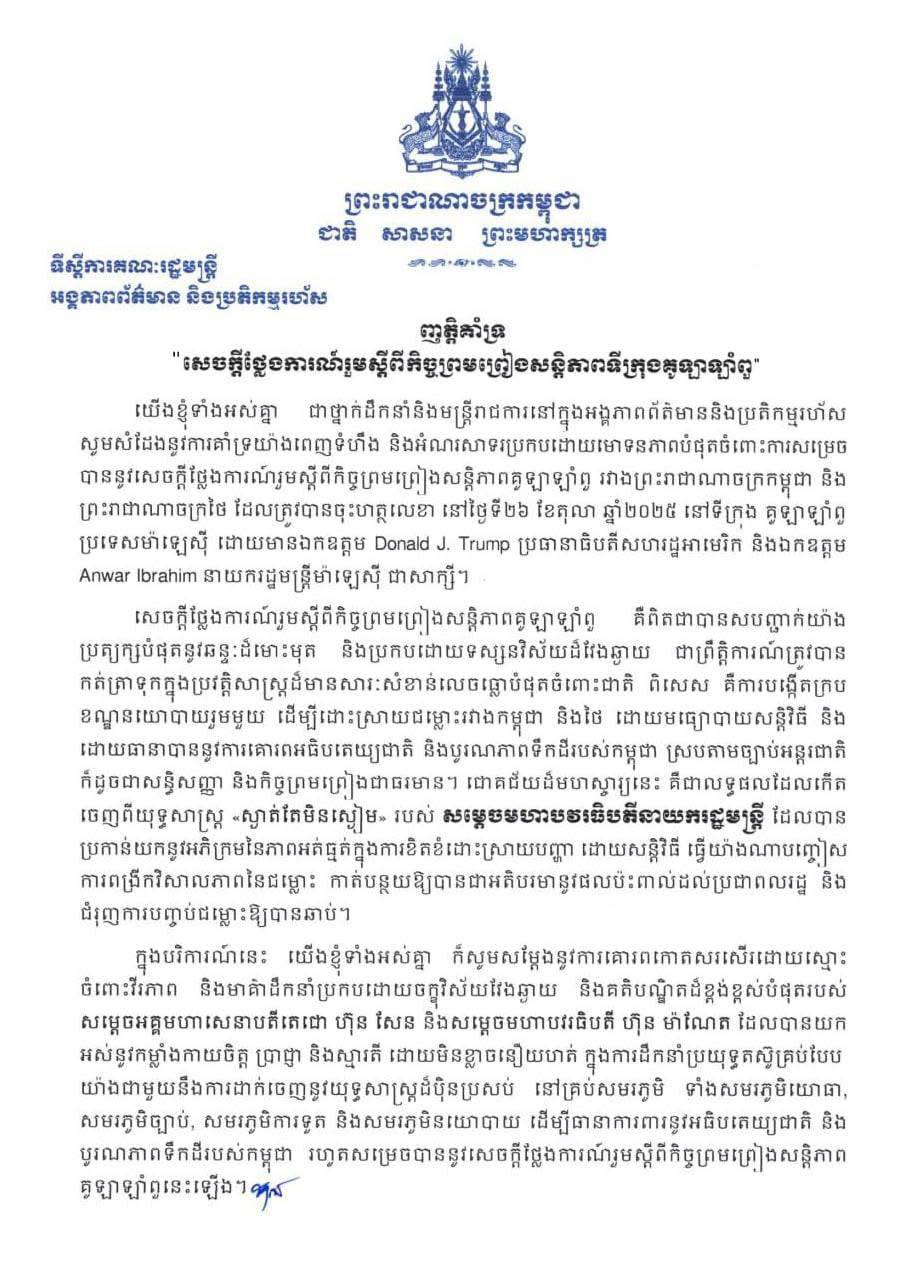 ភ្នំពេញ ៖ ថ្នាក់ដឹកនាំនិងមន្ត្រីរាជការនៅក្នុងអង្គភាពព័ត៌មាននិងប្រតិកម្មរហ័ស សូមសំដែងនូវការគាំទ្រយ៉ាងពេញទំហឹង និងអំណរសាទរប្រកបដោយមោទនភាពបំផុត ចំពោះការសម្រេចបាននូវសេចក្ដីថ្លែងការណ៍រួមស្ដីពីកិច្ចព្រមព្រៀងសន្តិភាពគូឡាឡាំពួ រវាងព្រះរាជាណាចក្រកម្ពុជា និងព្រះរាជាណាចក្រថៃ ដែលត្រូវបានចុះហត្ថលេខា នៅថ្ងៃទី២៦ ខែតុលា ឆ្នាំ២០២៥ នៅទីក្រុងគូឡាឡាំពួ ប្រទេសម៉ាឡេស៊ី ដោយមានឯកឧត្តម Donald J. Trump ប្រធានាធិបតីសហរដ្ឋអាមេរិក និងឯកឧត្តម Anwar Ibrahim នាយករដ្ឋមន្ត្រីម៉ាឡេស៊ីជាសាក្សី។