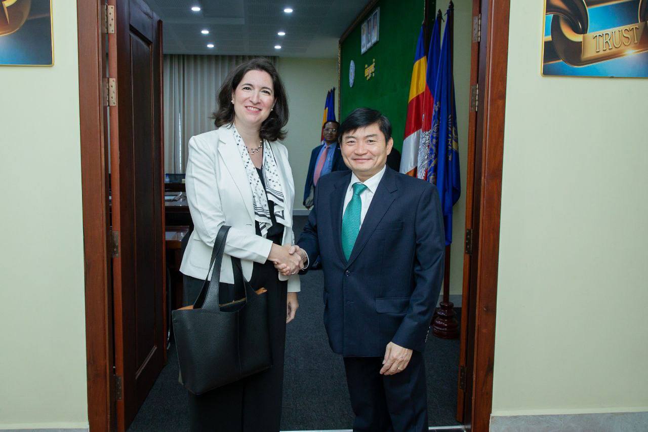 ភ្នំពេញ៖ លោក ហេង សួរ រដ្ឋមន្រ្តីក្រសួងការងារ និងបណ្តុះបណ្តាលវិជ្ជាជីវៈ បានទទួលជួបជាមួយប្រតិភូធនាគារពិភពលោកដឹកនាំដោយ លោកស្រី Tania Meyer ប្រធានគ្រប់គ្រងធនាគារពិភពលោកប្រចាំនៅកម្ពុជា កាលពីថ្ងៃទី២៨ ខែតុលា ឆ្នាំ២០២៥ នៅទីស្តីការក្រសួង ដើម្បីផ្លាស់ប្តូរយោបល់និងចែករំលែកព័ត៌មានអំពីការជួយគាំទ្ររបស់ធនាគារពិភពលោកចំពោះពលករខ្មែរ ដែលត្រឡប់មកពីប្រទេសថៃ ស្តីពីការស្វែងរកការងារធ្វើ និងការបណ្តុះបណ្តាលជំនាញបច្ចេកទេស និងវិជ្ជាជីវៈតាមរយៈយន្តការគាំទ្របឋមភ្លាមៗ និងរយៈពេលមធ្យម។