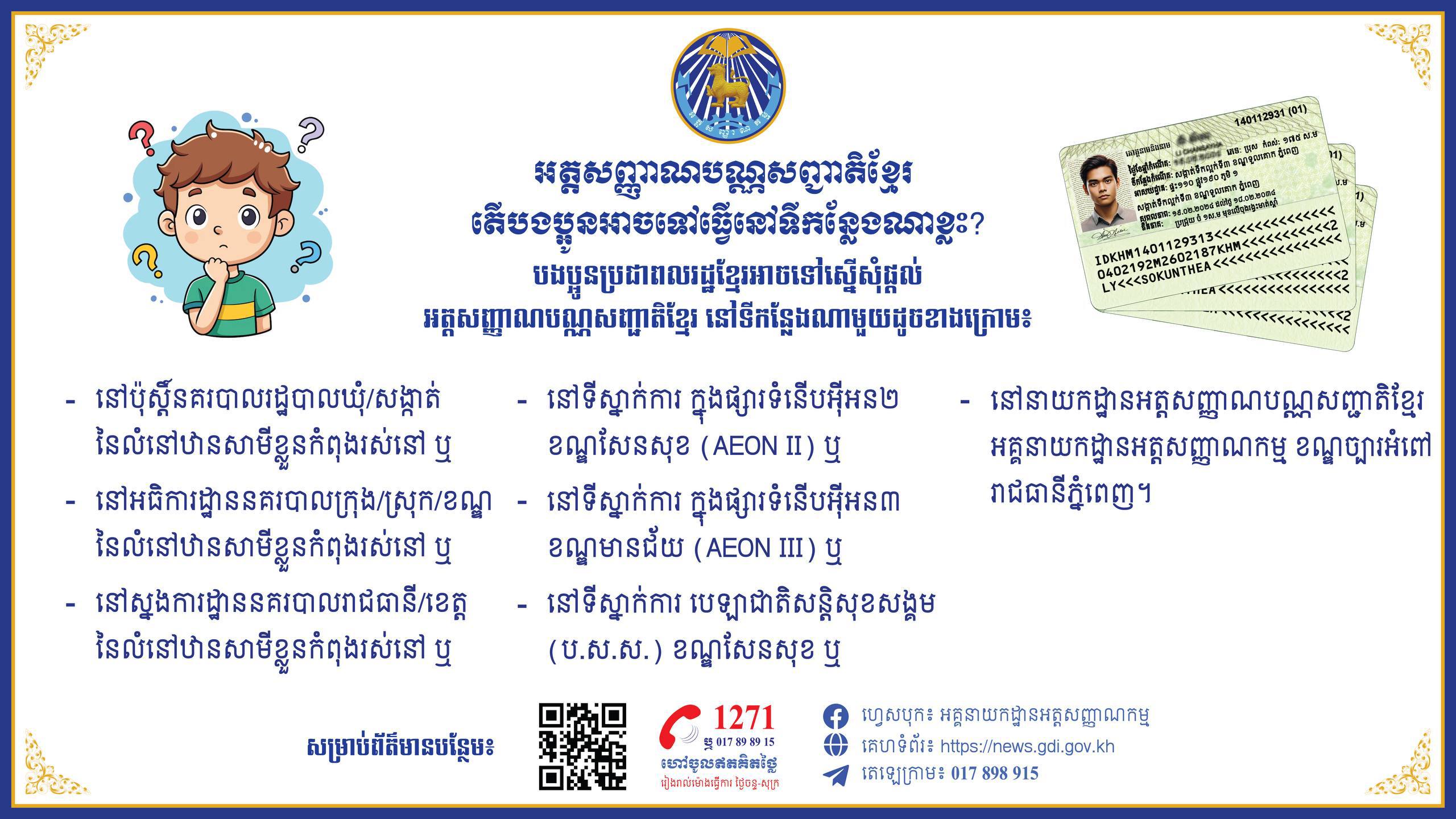 ភ្នំពេញ៖ យោងតាមនាយកដ្ឋាននគរបាលអត្តសញ្ញាណកម្ម នៅថ្ងៃទី២៩ ខែតុលា ឆ្នាំ២០២៥នេះ បានឱ្យដឹងថា កាន់តែមានភាពងាយស្រួល បងប្អូនប្រជាពលរដ្ឋ អាចអញ្ជើញទៅស្នេីសុំផ្តល់ និងបន្តសុពលភាពអត្តសញ្ញាណបណ្ណសញ្ជាតិខ្មែរ បាននៅទីតាំងណាមួយ ដូចខាងក្រោម ៖