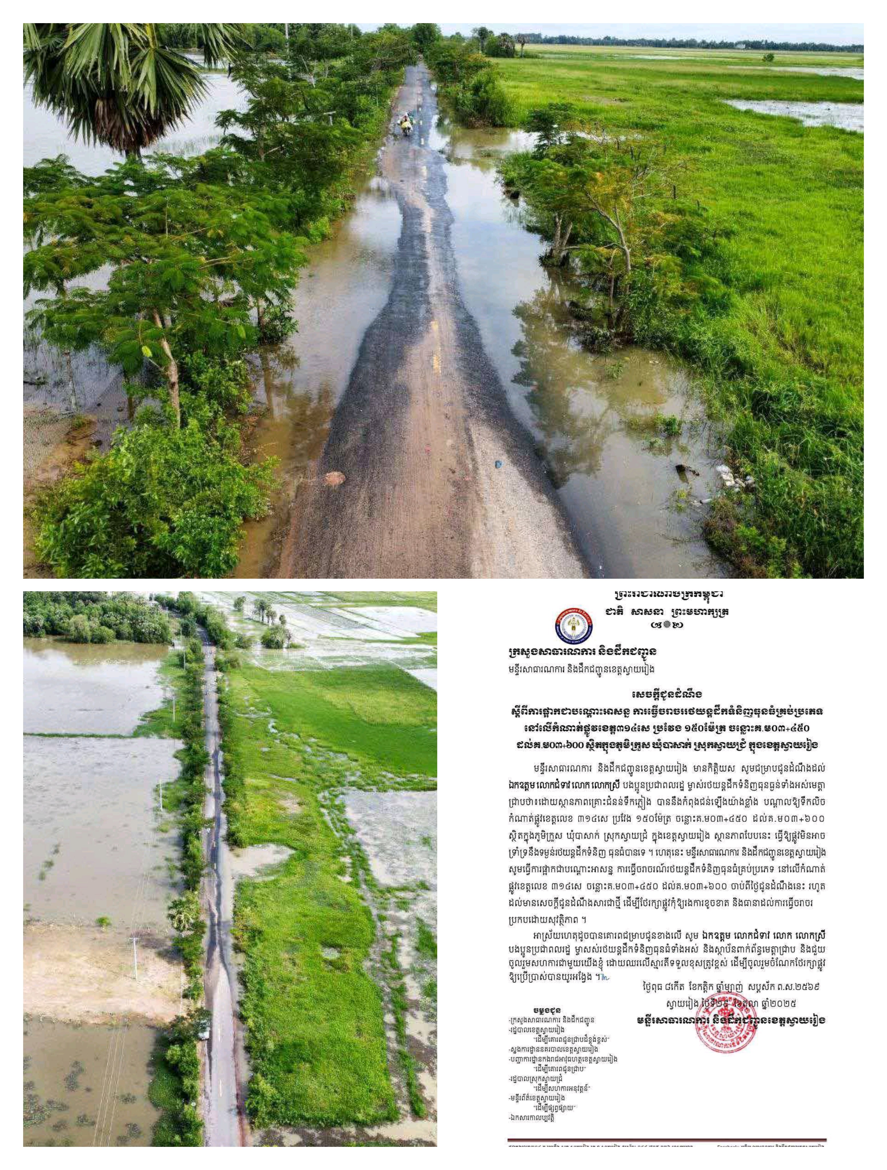 ខេត្តស្វាយរៀង ៖ មន្ទីរសាធារណការ និងដឹកជញ្ជូនខេត្តស្វាយរៀង មានកិត្តិយស សូមជម្រាបជូនដំណឹងដល់ ឯកឧត្តម លោកជំទាវ លោក លោកស្រី បងប្អូនប្រជាពលរដ្ឋ ម្ចាស់រថយន្តដឹកទំនិញធុនធ្ងន់ទាំងអស់មេត្តា ជ្រាបថា៖ដោយស្ថានភាពគ្រោះជំនន់ទឹកភ្លៀង បាននឹងកំពុងជន់ឡើងយ៉ាងខ្លាំង បណ្តាលឱ្យទឹកលិច កំណាត់ផ្លូវខេត្តលេខ ៣១៤សេ ប្រវែង ១៥០ម៉ែត្រ ចន្លោះគ.ម០៣+៤៥០ ដល់គ.ម០៣+៦០០ ស្ថិតក្នុងភូមិក្រួស ឃុំបាសាក់ ស្រុកស្វាយជ្រំ ក្នុងខេត្តស្វាយរៀង ស្ថានភាពបែបនេះ ធ្វើឱ្យផ្លូវមិនអាច ទ្រាំទ្រនឹងទម្ងន់រថយន្តដឹកទំនិញ ធុនធំបានទេ ។ ហេតុនេះ មន្ទីរសាធារណការ និងដឹកជញ្ជូនខេត្តស្វាយរៀង សូមធ្វើការផ្អាកជាបណ្តោះអាសន្ន ការធ្វើចរាចរណ៍រថយន្តដឹកទំនិញធុនធំគ្រប់ប្រភេទ នៅលើកំណាត់ ផ្លូវខេត្តលេខ ៣១៤សេ ចន្លោះគ.ម០៣+៤៥០ ដល់គ.ម០៣+៦០០ ចាប់ពីថ្ងៃជូនដំណឹងនេះ រហូត ដល់មានសេចក្តីជូនដំណឹងសារជាថ្មី ដើម្បីថែរក្សាផ្លូវកុំឱ្យរងការខូចខាត និងធានាដល់ការធ្វើចរាចរ ប្រកបដោយសុវត្ថិភាព ។