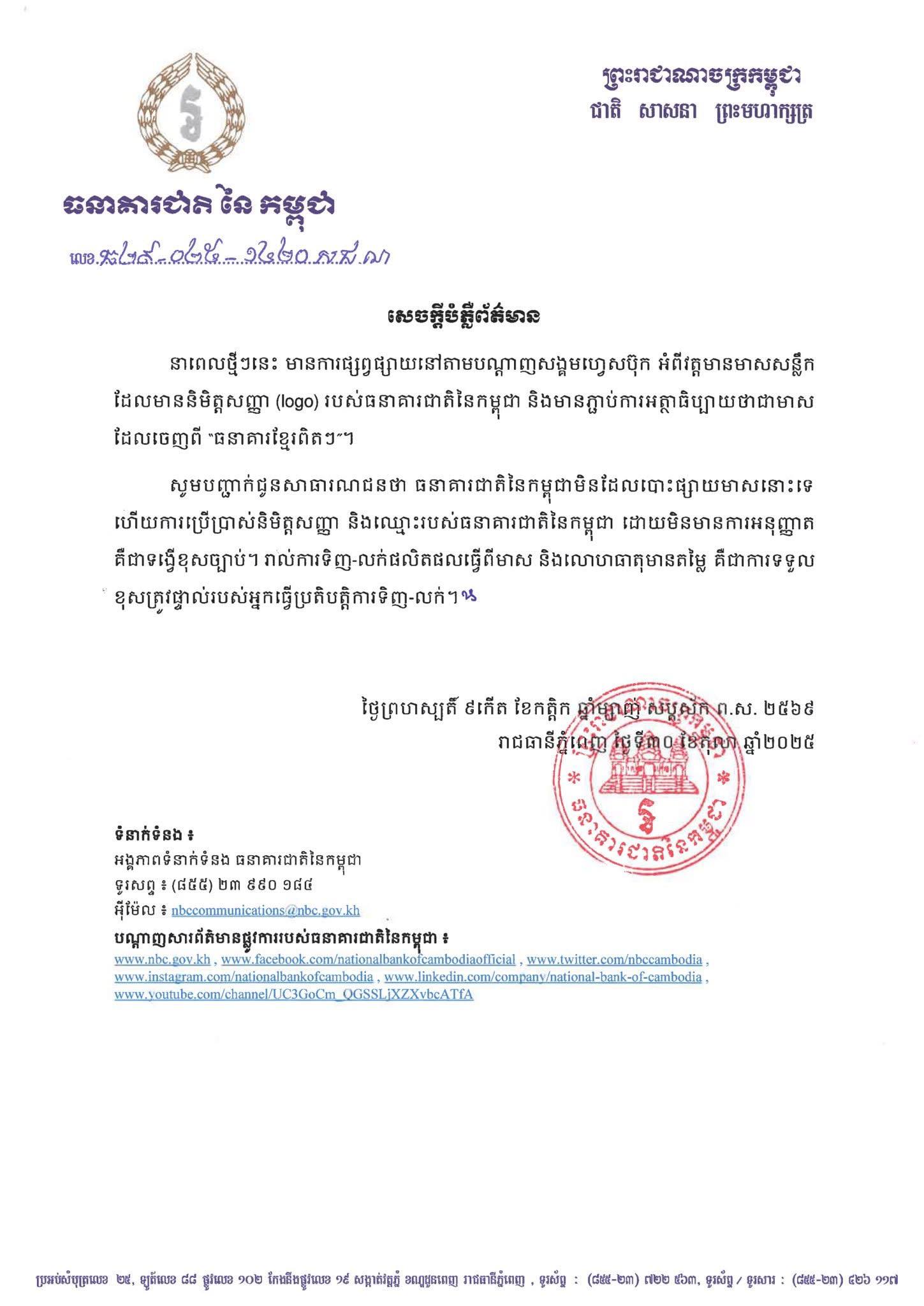 ភ្នំពេញ៖ ធនាគារជាតិនៃកម្ពុជា នៅរសៀលថ្ងៃទី៣០ ខែតុលា ឆ្នាំ២០២៥នេះ បានឱ្យដឹងថា នាពេលថ្មីៗនេះ មានការផ្សព្វផ្សាយនៅតាមបណ្តាញសង្គមហ្វេសប៊ុក អំពីវត្តមានមាសសន្លឹក ដែលមាននិមិត្តសញ្ញា (logo) របស់ធនាគារជាតិនៃកម្ពុជា និងមានភ្ជាប់ការអត្ថាធិប្បាយថាជាមាស ដែលចេញពី “ធនាគារខ្មែរពិតៗ”។
