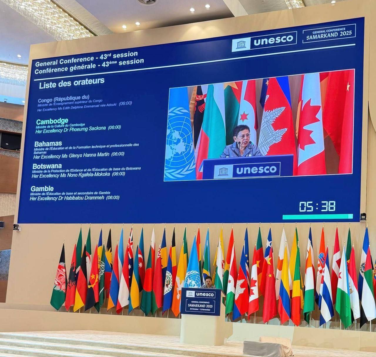 ពីប្រទេសអ៊ូសបេគីស្តង់ ៖ នៅទីក្រុងសាម៉ាកាន់ ប្រទេសអ៊ូសបេគីស្តង់ នារសៀលថ្ងៃទី០៣ ខែវិច្ឆិកា ឆ្នាំ២០២៥ លោកស្រីបណ្ឌិតសភាចារ្យ ភឿង សកុណា រដ្ឋមន្រ្តីក្រសួងវប្បធម៌ និងវិចិត្រសិល្បៈ អញ្ជើញថ្លែងសន្ទរកថាអំពីគោលនយោបាយរបស់រាជរដ្ឋាភិបាលកម្ពុជាក្នុងអង្គមហាសន្និបាតលើកទី៤៣នៃអង្គការយូណេស្កូ ដោយបានបញ្ជាក់ជាថ្មីនូវការប្តេជ្ញាចិត្តរបស់រាជរដ្ឋាភិបាលកម្ពុជាក្នុងការគាំទ្របេសកកម្មរបស់អង្គការយូណេស្កូក្នុងការស្ថាបនាសន្តិភាពតាមរយៈការអប់រំ វប្បធម៌ វិទ្យាសាស្ត្រ និងទំនាក់ទំនង ស្របតាមយុទ្ធសាស្ត្របញ្ចកោណ ដំណាក់កាលទី១។