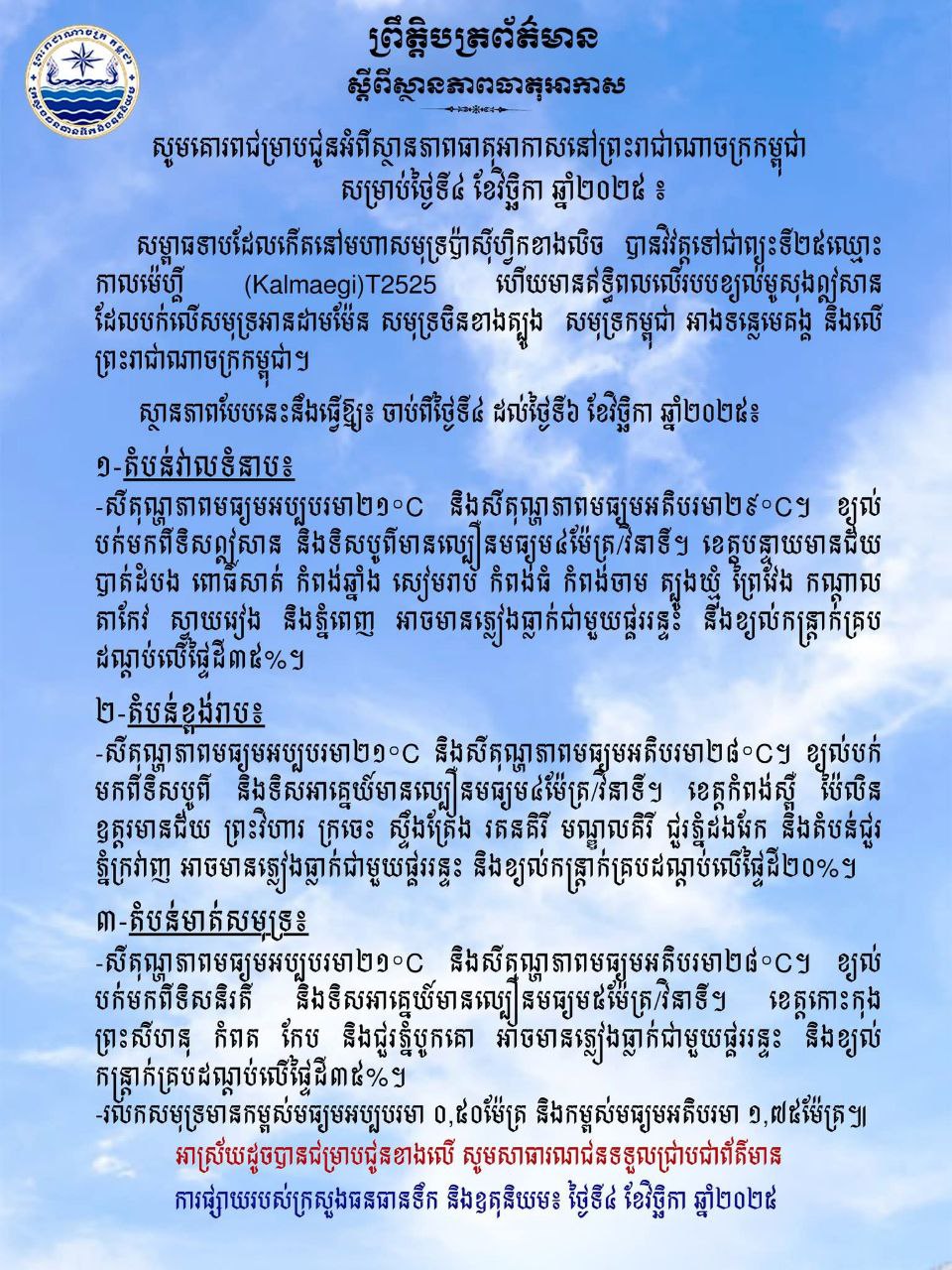 សូមគោរពជម្រាបជូនអំពីស្ថានភាពធាតុអាកាសនៅព្រះរាជាណាចក្រកម្ពុជា សម្រាប់ថ្ងៃទី៤ ខែវិច្ឆិកា ឆ្នាំ២០២៥ ៖
