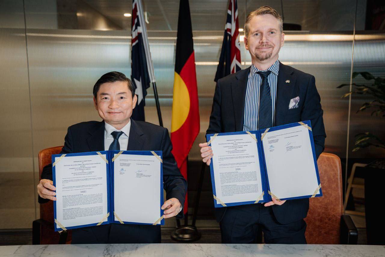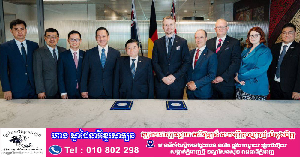 អូស្ត្រាលី៖ លោក ហេង សួរ រដ្ឋមន្ត្រីក្រសួងការងារ និងបណ្តុះបណ្តាលវិជ្ជាជីវៈ និងលោក Cameron Baker ប្រធានស្នងការជំនាញ នៃរដ្ឋអូស្ត្រាលីខាងត្បូង (South Australian Skills Commission) កាលពីថ្ងៃទី៤ ខែវិច្ឆិកា ឆ្នាំ២០២៥ បានរួមគ្នាចុះហត្ថលេខា លើកិច្ចព្រមព្រៀងសហប្រតិបត្តិការ ផ្នែកបណ្តុះបណ្តាលបច្ចេកទេស និងវិជ្ជាជីវៈ និងកម្មវិធីហាត់ការ ដែលអាចនឹងអនុញ្ញាតឱ្យសិស្សនិស្សិតកម្ពុជា ដែលកំពុងរៀនថ្នាក់សញ្ញាបត្របច្ចេកទេស និងវិជ្ជាជីវៈ ១-៣ ដែលចុះបញ្ជិកានៅក្រសួងការងារ និងបណ្តុះបណ្តាលវិជ្ជាជីវៈ និងទទួលស្គាល់ដោយស្នងការជំនាញអូស្ត្រាលី អាចទៅបន្តការសិក្សានៅគ្រឹះស្ថានបណ្តុះបណ្តាលជំនាញវិជ្ជាជីវៈ និងចុះហាត់ការផ្ទាល់រយៈពេល ២ឆ្នាំ នៅតាមរោងជាង ការដ្ឋាន និងកសិដ្ឋាននានា ក្នុងរដ្ឋអូស្ត្រាលីខាងត្បូង នៃប្រទេសអូស្ត្រាលី។