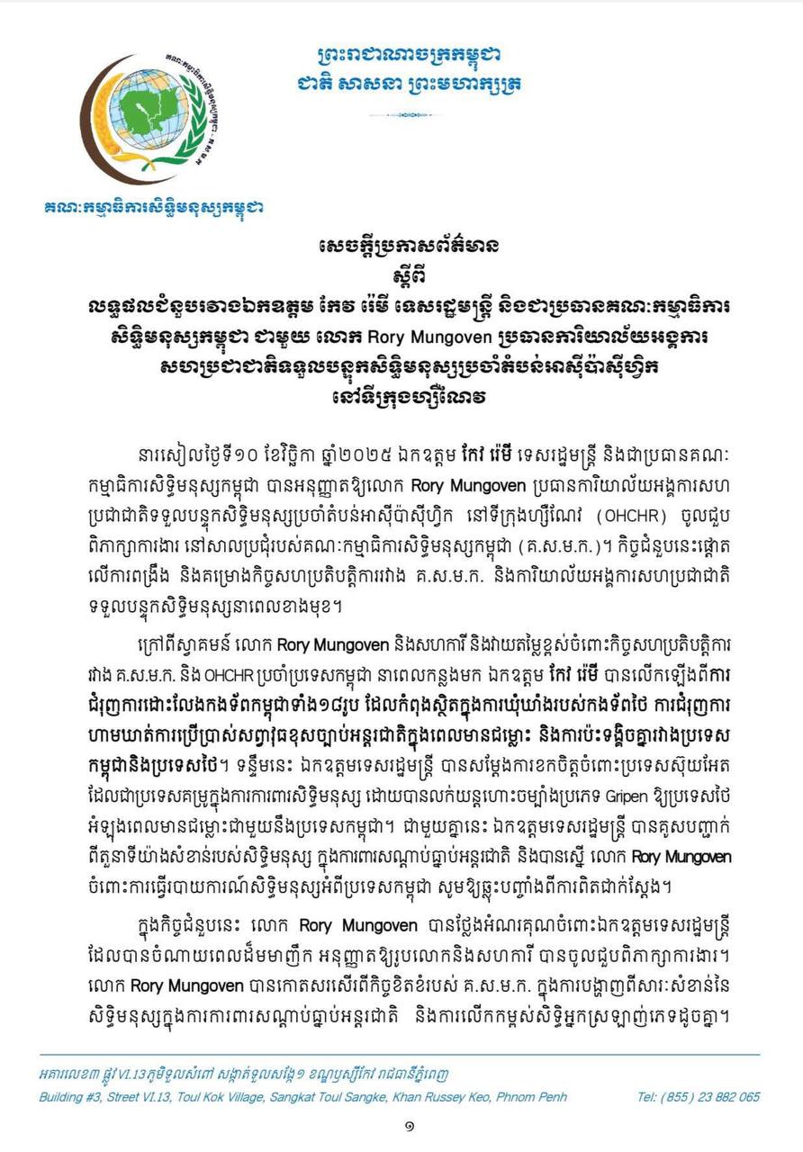 សូមបញ្ជាក់ថា ៖ នារសៀលថ្ងៃទី១០ ខែវិច្ឆិកា ឆ្នាំ២០២៥ លោក កែវ រ៉េមី ទេសរដ្ឋមន្ត្រី និងជាប្រធានគណៈ កម្មាធិការសិទ្ធិមនុស្សកម្ពុជា បានអនុញ្ញាតឱ្យលោក Rory Mungoven ប្រធានការិយាល័យអង្គការសហ ប្រជាជាតិទទួលបន្ទុកសិទ្ធិមនុស្សប្រចាំតំបន់អាស៊ីប៉ាស៊ីហ្វិក នៅទីក្រុងហ្សឺណែវ (OHCHR) ចូលជួប ពិភាក្សាការងារ នៅសាលប្រជុំរបស់គណៈកម្មាធិការសិទ្ធិមនុស្សកម្ពុជា (គ.ស.ម.ក.)។ កិច្ចជំនួបនេះផ្តោត លើការពង្រឹង និងគម្រោងកិច្ចសហប្រតិបត្តិការរវាង គ.ស.ម.ក. និងការិយាល័យអង្គការសហប្រជាជាតិ ទទួលបន្ទុកសិទ្ធិមនុស្សនាពេលខាងមុខ។