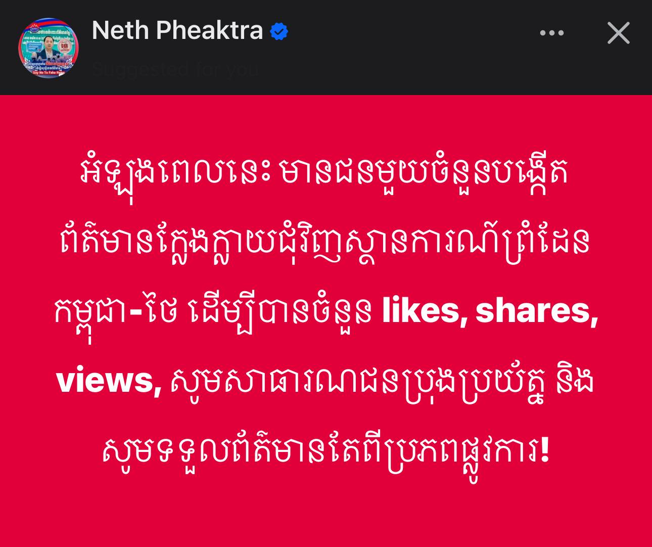 ភ្នំពេញ៖ លោក នេត្រ ភក្ត្រា រដ្ឋមន្រ្តីក្រសួងព័ត៍មាន នៅព្រឹកថ្ងៃទី១១ ខែវិច្ឆិកា ឆ្នាំ២០២៥នេះ បានឱ្យដឹងថា អំឡុងពេលនេះ មានជនមួយចំនួនបង្កើតព័ត៌មានក្លែងក្លាយជុំវិញស្ថានការណ៍ព្រំដែនកម្ពុជា-ថៃ ដើម្បីបានចំនួន likes, shares, views, សូមសាធារណជនប្រុងប្រយ័ត្ន និងសូមទទួលព័ត៌មានតែពីប្រភពផ្លូវការ!
