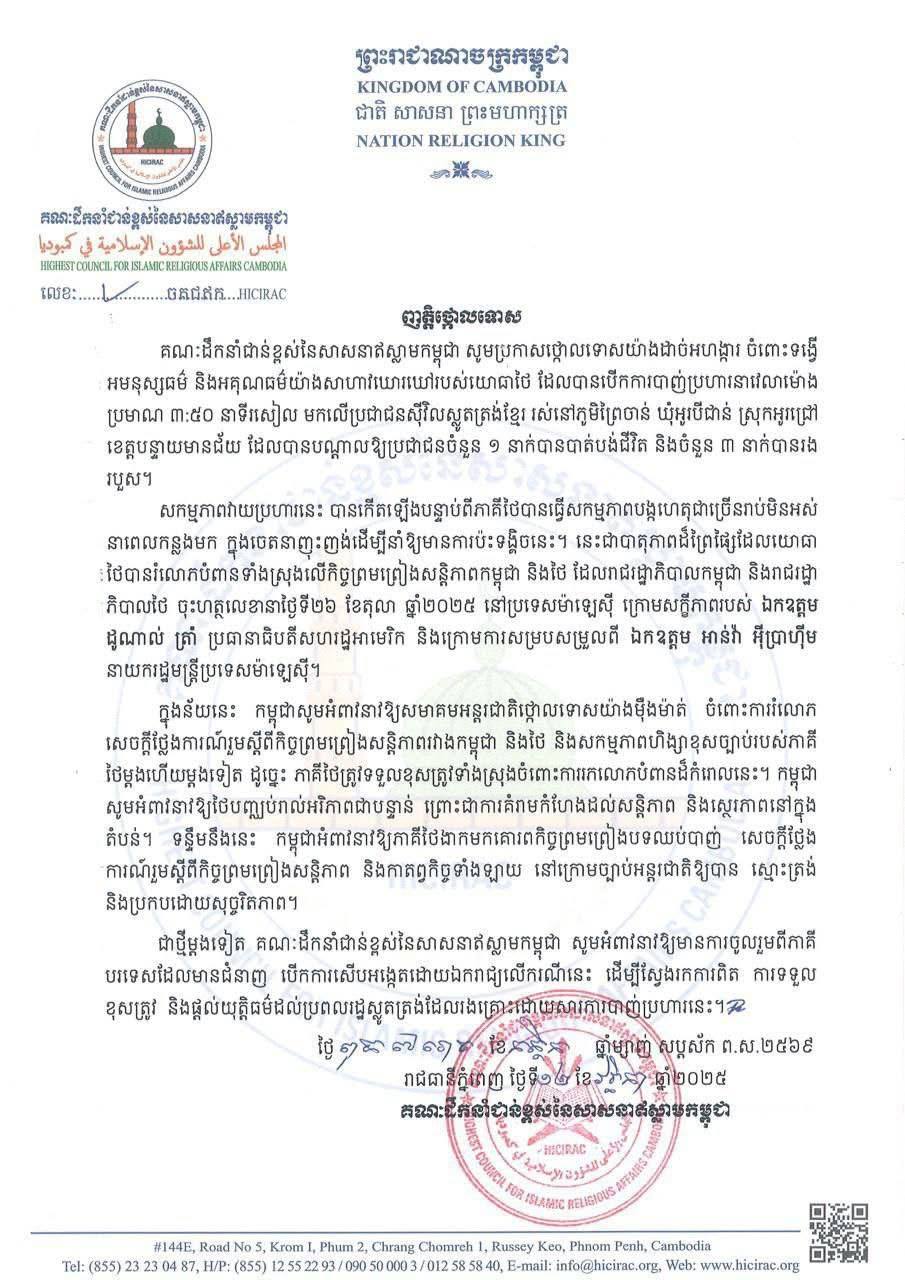 ជាមួយគ្នានេះ ព្រឹទ្ធសភាកម្ពុជាប្រកាសគាំទ្រយ៉ាងពេញទំហឹងចំពោះសេចក្តីថ្លែងការណ៍របស់សម្តេច នាយករដ្ឋមន្ត្រីហ៊ុន ម៉ាណែត នៅថ្ងៃទី១២ ខែវិច្ឆិកា ឆ្នាំ២០២៥ ដែលបានថ្កោលទោសយ៉ាងដាច់អហង្ការចំពោះទង្វើដ៏ព្រៃផ្សៃអស់ទាំងនោះ និងបញ្ជាក់ជាថ្មីនូវការប្តេជ្ញា ចិត្តដ៏មុតមាំរបស់កម្ពុជាចំពោះសន្តិភាព ស្ថិរភាពក្នុងតំបន់ និងការដោះស្រាយវិវាទដោយសន្តិវិធី តាមរយៈកិច្ចសន្ទនា និងច្បាប់អន្តរជាតិ។ ព្រឹទ្ធសភាប្រកាន់ជំហរឯកភាពជាធ្លុងមួយយ៉ាងរឹងមាំជាមួយរាជរដ្ឋាភិបាល ក្នុងការការពារអធិបតេយ្យភាព បូរណភាពទឹកដី និងសុខសុវត្ថិភាពរបស់ប្រជាពលរដ្ឋកម្ពុជា៕