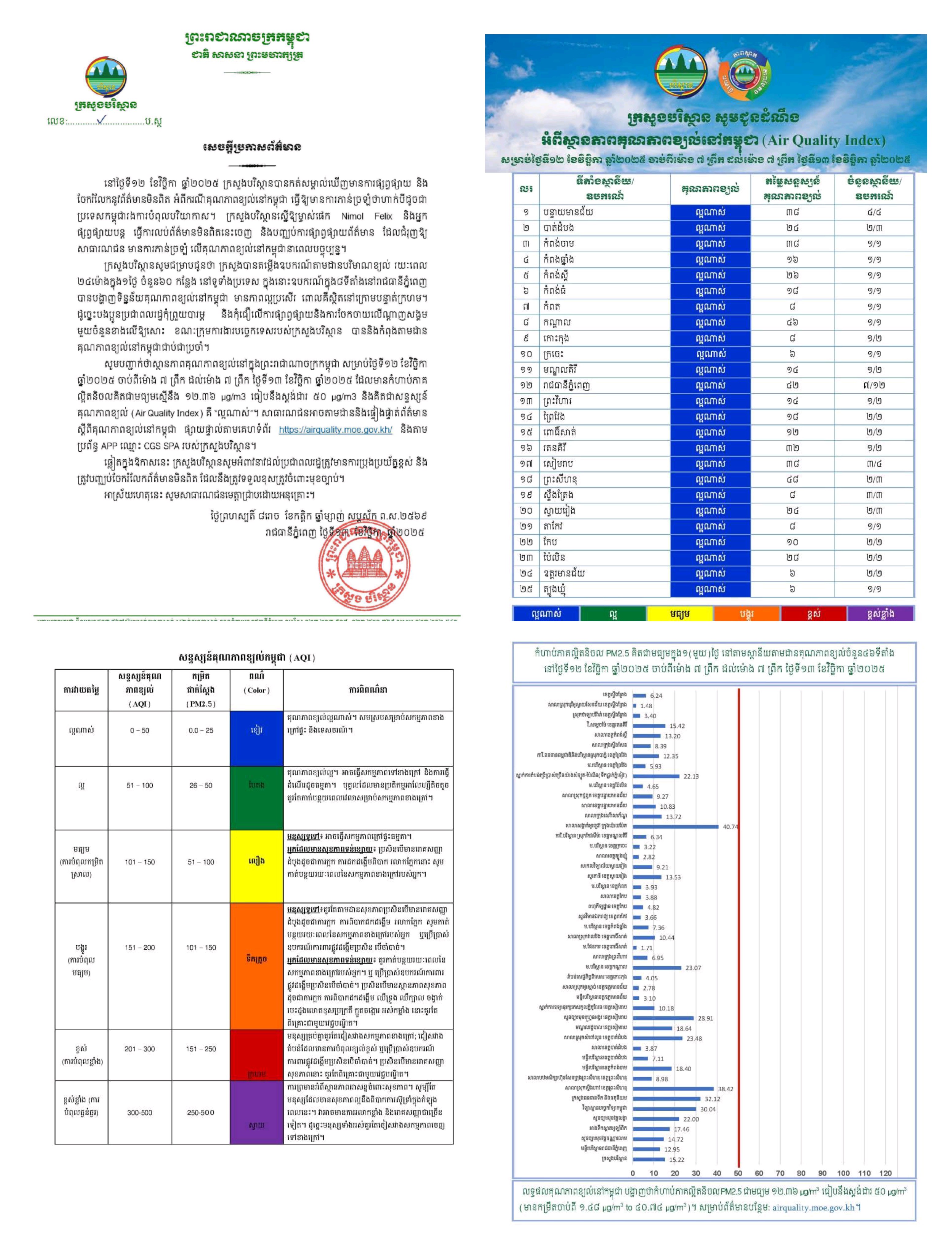 ភ្នំពេញ៖ យោងតាមសេចក្តីប្រកាសព័ត៌មានរបស់ក្រសួងបរិស្ថាន នៅថ្ងៃទី១២ ខែវិច្ឆិកា ឆ្នាំ២០២៥ បានឱ្យដឹងថា ក្រសួងបរិស្ថាន បានកត់សម្គាល់ឃើញមានការផ្សព្វផ្សាយ និងចែករំលែកនូវព័ត៌មានមិនពិត អំពីករណីគុណភាពខ្យល់នៅកម្ពុជា ធ្វើឱ្យមានការភាន់ច្រឡំថាហាក់បីដូចជាប្រទេសកម្ពុជារងការបំពុលបរិយាកាស។