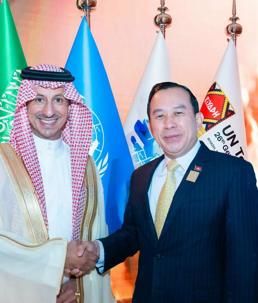 ឆ្លៀត​ក្នុង​ឱកាស​នេះ​ផង​ដែរ ឯកឧត្តម​រដ្ឋមន្ត្រី ក៏​បាន​ថ្លែងអំណរគុណ​យ៉ាង​ជ្រាលជ្រៅ​ចំពោះ​ឯ ក​ឧត្តម​រដ្ឋ​ម​ន្រី្ត​ទេសចរណ៍​អា​រ៉ា​ប៊ី​សា​អ៊ូ​ឌី​ត ដែល​បាន​ផ្តល់​នូវ​បដិសណ្ឋារកិច្ច​ដ៏​កក់ក្តៅ និង ឧត្តុង្គឧត្តម​ដល់​គណៈប្រតិភូ​ជាន់ខ្ពស់​កម្ពុជា ព្រមទាំង​ចូលរួម​អបអរសាទរ​ចំពោះ ជោគជ័យ​ដ៏​ត្រចះត្រចង់​របស់​ឯកឧត្តម​រដ្ឋមន្ត្រី និង​ប្រជាជន​អា​រ៉ា​ប៊ី​សា​អ៊ូ​ឌី​ត​ក្នុង ការ​រៀបចំ​មហាសន្និបាត​លើក​ទី​២៦ នៃ​អង្គការ​ទេសចរណ៍​សហប្រជាជាតិ​នា​ពេល​នេះ​។