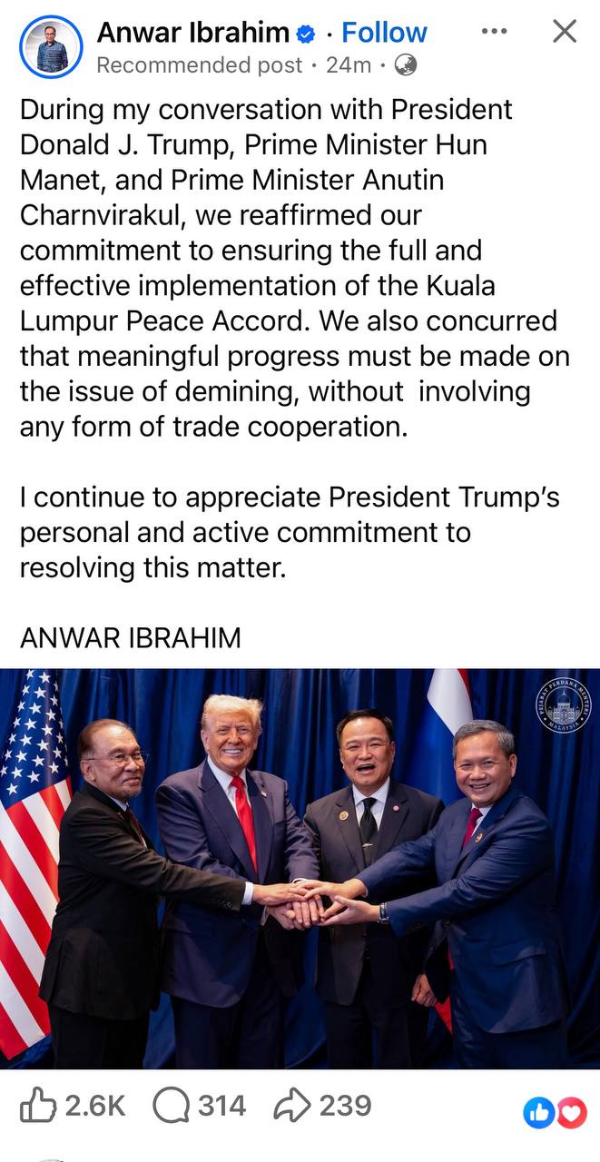 ទីក្រុងគូឡាឡាំពួ ៖ នាយករដ្ឋមន្ត្រីម៉ាឡេស៊ី លោក Anwar Ibrahim នៅរសៀលថ្ងៃទី១៦ ខែវិច្ឆិកា ឆ្នាំ២០២៥ បានបង្ហោះលើផេកផ្ទាល់ខ្លួនថា ៖ ក្នុងអំឡុងពេលនៃការសន្ទនារបស់ខ្ញុំជាមួយលោកប្រធានាធិបតី ដូណាល់ ជេ. ត្រាំ លោកនាយករដ្ឋមន្ត្រី ហ៊ុន ម៉ាណែត និងលោកនាយករដ្ឋមន្ត្រី អនុទីន ឆានវីរៈគុល យើងបានបញ្ជាក់ជាថ្មីនូវការប្តេជ្ញាចិត្តរបស់យើងក្នុងការធានាការអនុវត្តកិច្ចព្រមព្រៀងសន្តិភាពកូឡាឡាំពួរឲ្យបានពេញលេញ និងមានប្រសិទ្ធភាព។ នាយករដ្ឋមន្ត្រីម៉ាឡេស៊ី លោក Anwar Ibrahim បន្តថា ៖ យើងក៏បានឯកភាពគ្នាផងដែរថា វឌ្ឍនភាពដ៏មានអត្ថន័យត្រូវតែធ្វើឡើងលើបញ្ហាដោះមីន ដោយមិនពាក់ព័ន្ធនឹងកិច្ចសហប្រតិបត្តិការពាណិជ្ជកម្មណាមួយឡើយ។