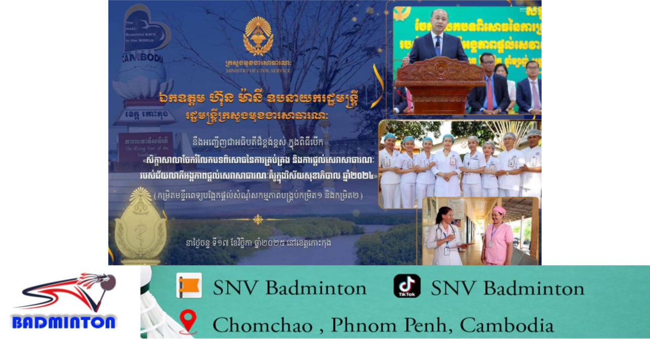 ខេត្តកោះកុង ៖ ព្រឹកស្អែក ! លោក ហ៊ុន ម៉ានី ឧបនាយករដ្ឋមន្រ្តី រដ្ឋមន្រ្តីក្រសួងមុខងារសាធារណៈ និងជាប្រធានគណៈកម្មការវាយតម្លៃអង្គភាពផ្តល់សេវាសាធារណៈថ្នាក់ជាតិ (គ.វ.ជ.) នឹងអញ្ជើញជាអធិបតីដ៏ខ្ពង់ខ្ពស់ ក្នុងពិធីបើកសិក្ខាសាលាចែករំលែកបទពិសោធនៃការគ្រប់គ្រង និងការផ្តល់សេវាសាធារណៈរបស់ជ័យលាភីអង្គភាពផ្តល់សេវាសាធារណៈគំរូក្នុងវិស័យសុខាភិបាលឆ្នាំ២០២៤ សម្រាប់កម្រិតមន្ទីរពេទ្យបង្អែកផ្តល់សេវាសំណុំសកម្មភាពបង្រ្គប់កម្រិត១ និងកម្រិត២ នៅសាលមហោស្រពខេត្តកោះកុង។