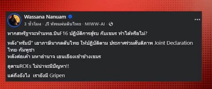 ដោយដកស្រង់សម្ដីអ្នកកាសែតជើងចាស់ និងល្បីមួយរូបរបស់ថៃគឺលោកស្រី Wassana Nanuam សារព័ត៍មាន Top News បានផ្សាយថា សហរដ្ឋអាមេរិកអាចហាមកងទ័ពថៃមិនឲ្យប្រើយន្តហោះចម្បាំង F16 ក្នុងសមរភូមិប្រយុទ្ធជាមួយកម្ពុជា បន្ទាប់ពីក្រុងវ៉ាស៊ីនតោនបង្ហាញជំហរងាកមកគាំទ្រក្រុងភ្នំពេញ។ ប្រភពដដែលនេះ បានបន្ថែមថា យ៉ាងណាមិញ បើតាមច្បាប់ទ័ពថៃ (Rules of Engagement) ក្រុងបាងកកនៅតែអាចមានសិទ្ធិប្រើប្រាស់ F16 នៅក្នុងការប្រយុទ្ធប្រឆាំងនឹងកម្ពុជា ហើយលើសពីនេះទៅទៀត ទោះគ្មាន F16 ក៏ថៃនៅតែមានយន្តហោះចម្បាំង Gripen ដែលខ្លួនបានទិញពីស៊ុយអែតផងដែរ។