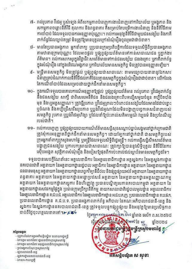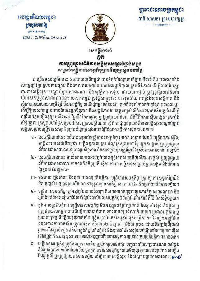 ភ្នំពេញ ៖ ជាថ្មីម្ដងទៀត ខ្ញុំសូមជូនសេចក្ដីណែនាំនេះម្ដងទៀត(ចុះថ្ងៃទី២៧ធ្នូ២០២៤) ដើម្បីឈ្វេងយល់ និងសហការអនុវត្ត ទាំងមន្ត្រីអនុវត្តច្បាប់ និងមិត្តអ្នកសារព័ត៌មាន។ រឿងកើតឡើងដដែលៗពេកហើយ។ នេះជាលើកឡើងពីលោកបណ្ឌិត ទូច សុខៈ (ឃៈ) អ្នកនាំពាក្យរង ក្រសួងមហាផ្ទៃ នៅថ្ងៃទី១៩ ខែវិច្ឆិកា ឆ្នាំ២០២៥ នេះ ។