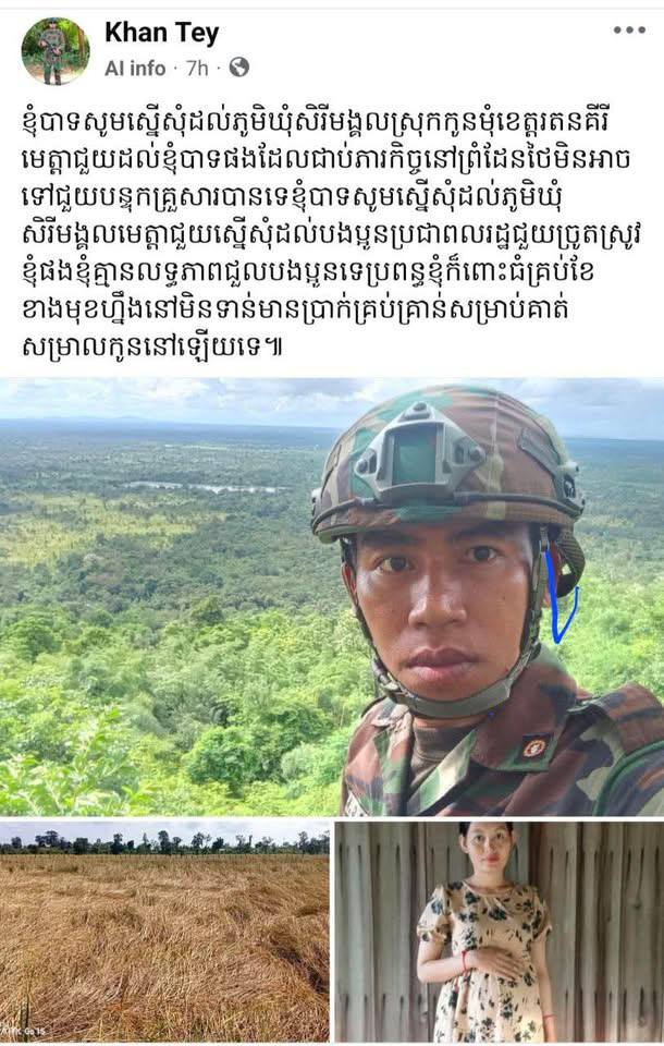 ខេត្តរតនគិរី ៖ នៅរសៀលថ្ងៃទី២០ ខែវិច្ឆិកា ឆ្នាំ២០២៥ លោកឧត្តមសេនីយ៍ទោ អ៊ុង សុភាព ស្នងការនគរបាលខេត្តរតនគិរី បានចេញបញ្ជាដល់កម្លាំងនគរបាល ចុះទៅជួបភរិយាវរ:កងទព័ដល់ផ្ទះ ដេីម្បីពិភាក្សានឹងជួយច្រូតកាត់ស្រូវជូនដល់យុទ្ធជនដែលជាប់ភារកិច្ចការពារព្រំដែននៅជួរមុខ(កម្ពុជា-ថៃ) ! នៅថ្ងៃស្អែក ត្រូវនឹងថ្ងៃទី២១ ខែវិច្ឆិកា ឆ្នាំ២០២៥ ដោយភរិយាលោក(Khan Tey)កំពុងមានផ្ទៃពោះមិនទាន់សំរាលកូន និងខ្វះខាតកម្លាំងពលកម្មថែមទៀត ព្រមទាំងមានអាស័យដ្ឋាននៅភូមិសិរីមង្គល ឃុំសិរីមង្គល ស្រុកកូនមុំ ខេត្តរតនគិរី ដោយពិនិត្យឃេីញបែបនេះលោកឧត្តមសេនីយ៍ទោស្នងការក៏នឹងឧបត្ថម្ភនូវថវិកាផ្ទាល់ខ្លួនរបស់លោកមួយចំនួនទៀតជូនដល់ភរិយាលោក Khan Tey សម្រាប់ដោះស្រាយបញ្ហា និងប្រេីប្រាស់ក្នុងពេលសម្រាលកូននាពេលខាងមុខ។