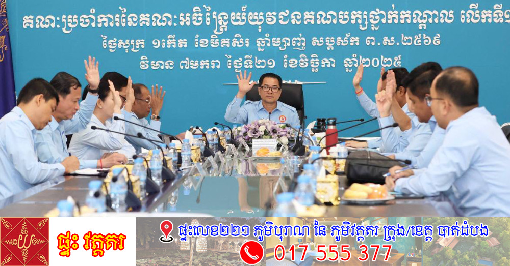 វិមាន៧មករា៖នៅរសៀលថ្ងៃសុក្រ ១កើត ខែមិគសិរ ឆ្នាំម្សាញ់ សប្តស័ក ពុទ្ធសករាជ ២៥៦៩ ត្រូវនឹងថ្ងៃទី២១ ខែវិច្ឆិកា ឆ្នាំ២០២៥ លោកបណ្ឌិត ជ្រុន ថេរ៉ាវ៉ាត អនុប្រធានយុវជនគណបក្សថ្នាក់កណ្តាល និងជាប្រធានគណៈប្រចាំការនៃគណៈអចិន្ត្រៃយ៍យុវជនគណបក្សថ្នាក់កណ្ដាល បានអញ្ជើញដឹកនាំកិច្ចប្រជុំគណៈប្រចាំការ នៃគណៈអចិន្ត្រៃយ៍យុវជនគណបក្សថ្នាក់កណ្តាលលើកទី១៦។