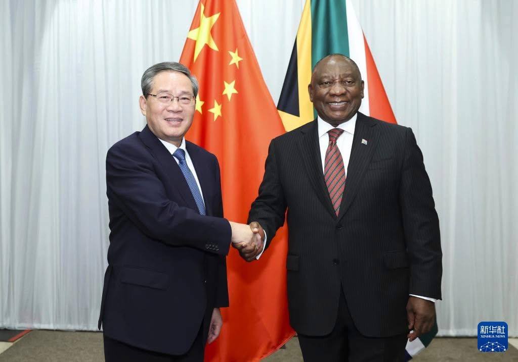 ថ្លែងក្នុង កិច្ចជំនួប លោក Li Qiang បាន លើកឡើង ថា ក្រោមការណែនាំជាយុទ្ធសាស្រ្ត របស់ ប្រមុខរដ្ឋ នៃ ប្រទេស ទាំងពីរ ប្រទេសចិន និងអាហ្វ្រិកខាងត្បូង បាន និង កំពុង ពួតដៃគ្នា ដើម្បី ជំរុញ ទំនាក់ទំនងភាពជាដៃគូសហប្រតិបត្តិការជាយុទ្ធសាស្ត្រគ្រប់ជ្រុងជ្រោយ ក្នុង យុគ សម័យ ថ្មី ក៏ដូចជា ខិតខំប្រឹងប្រែង ក្នុង ការ ផ្តល់ ផល ប្រយោជន៍ ជូន ដល់ ប្រជាជន នៃ ប្រទេស ទាំង ពីរ ។ ភាគី ចិន រីករាយ បន្ត ធ្វើកិច្ចខិតខំប្រឹងប្រែង ជា មួយ ភាគី អាហ្វ្រិក ខាងត្បូង ដើម្បី ផ្សព្វផ្សាយ ចំណង មិត្តភាពប្រពៃណី ធ្វើឱ្យស៊ីជម្រៅ នូវ ការកសាង ទំនុក ចិត្ត ខាង នយោ បាយ បង្កើនការបន្ស៊ីគ្នារវាងយុទ្ធសាស្រ្តអភិវឌ្ឍន៍នៃប្រទេសទាំងពីរ ក៏ដូចជា ធ្វើ ឱ្យ ស៊ីជម្រៅ នូវ កិច្ចសហប្រតិបត្តិការក្នុងគ្រប់វិស័យ ដូចជា ឧស្សាហកម្មរ៉ែ និង កិច្ចកសាង ហេដ្ឋា រចនាសម័្ពន្ធ ជាដើម និង កសាងសមិទ្ធផលថ្មីៗ ក្នុងកិច្ចសហប្រតិបតិ្តការ ដូចជា ឧស្សាហកម្ម រថយន្ត ជាដើម ក្នុងន័យ ជំរុញការអភិវឌ្ឍរួមនៃប្រទេសទាំងពីរ និង សាមគ្គីភាព និង កិច្ច សហ ប្រតិបតិ្តការ ចិន-អាហ្វ្រិក ឱ្យ បាន កាន់តែល្អ ។