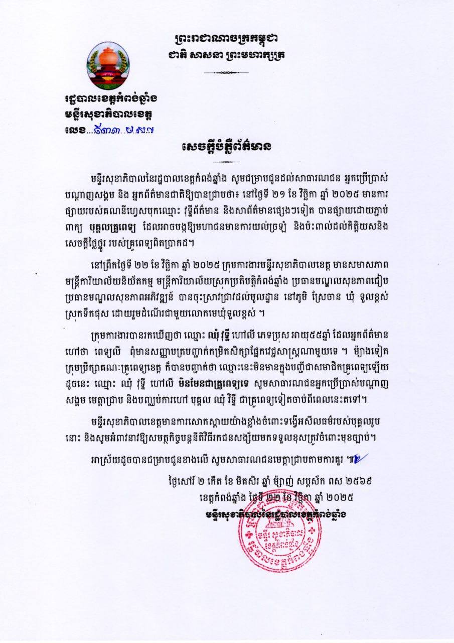 សូមជម្រាបជូនដល់សាធារណជន អ្នកប្រើប្រាស់បណ្តាញសង្គម និងអ្នកយកព័ត៌មានជាតិឱ្យបានជ្រាបថា៖ នៅថ្ងៃទី២១ ខែវិច្ឆិកា ឆ្នាំ២០២៥ មានការផ្សាយរបស់គណនីហ្វេសបុ៊កឈ្មោះ វុទ្ធីព័ត៌មាន និងសារព័ត៌មានផ្សេងៗទៀតបានផ្សាយដោយភ្ជាប់ពាក្យបុគ្គលគ្រូពេទ្យ ដែលអាចបង្កឱ្យមហាជនមានការយល់ច្រឡំ និងប៉ះពាល់ដល់កិត្តិយសនិងសេចក្តីថ្លៃថ្នូរ របស់គ្រូពេទ្យពិតប្រាកដ។