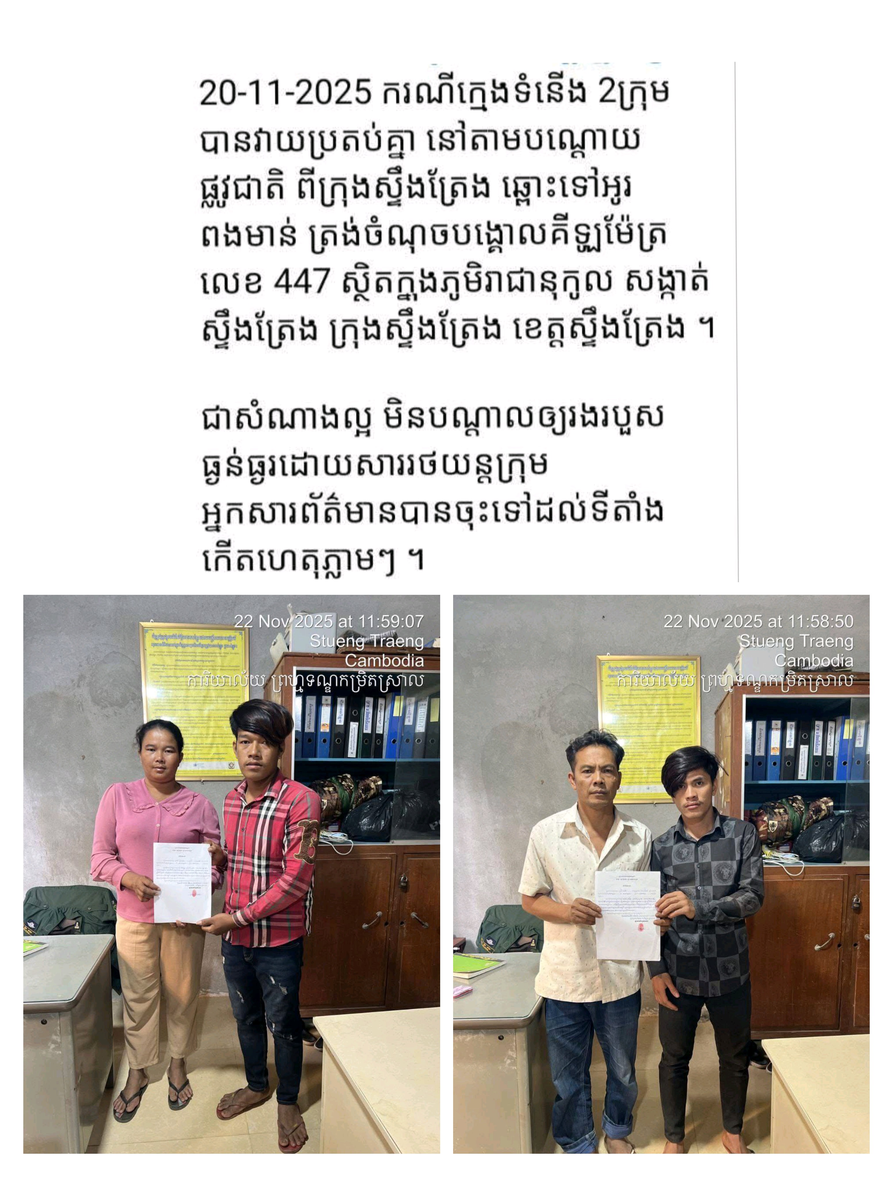 លោក សរ សុពុត្រា អភិបាល នៃគណៈអភិបាលខេត្តស្ទឹងត្រែង សូមបញ្ជាក់ថា នៅសល់មុខសញ្ញាពាក់ព័ន្ធ (ភាគីទំនាស់ម្ខាងទៀត) កំពុងគេចខ្លួន។ បើប្អូនៗ ឬអាណាព្យាបាល បានឃើញសារនេះហើយ សូមចូលខ្លួន ឬនាំកូន មកជួបសមត្ថកិច្ចជំនាញនៃស្នងការដ្ឋាននគរបាលខេត្តស្ទឹងត្រែង ដើម្បីនីតិវិធី។